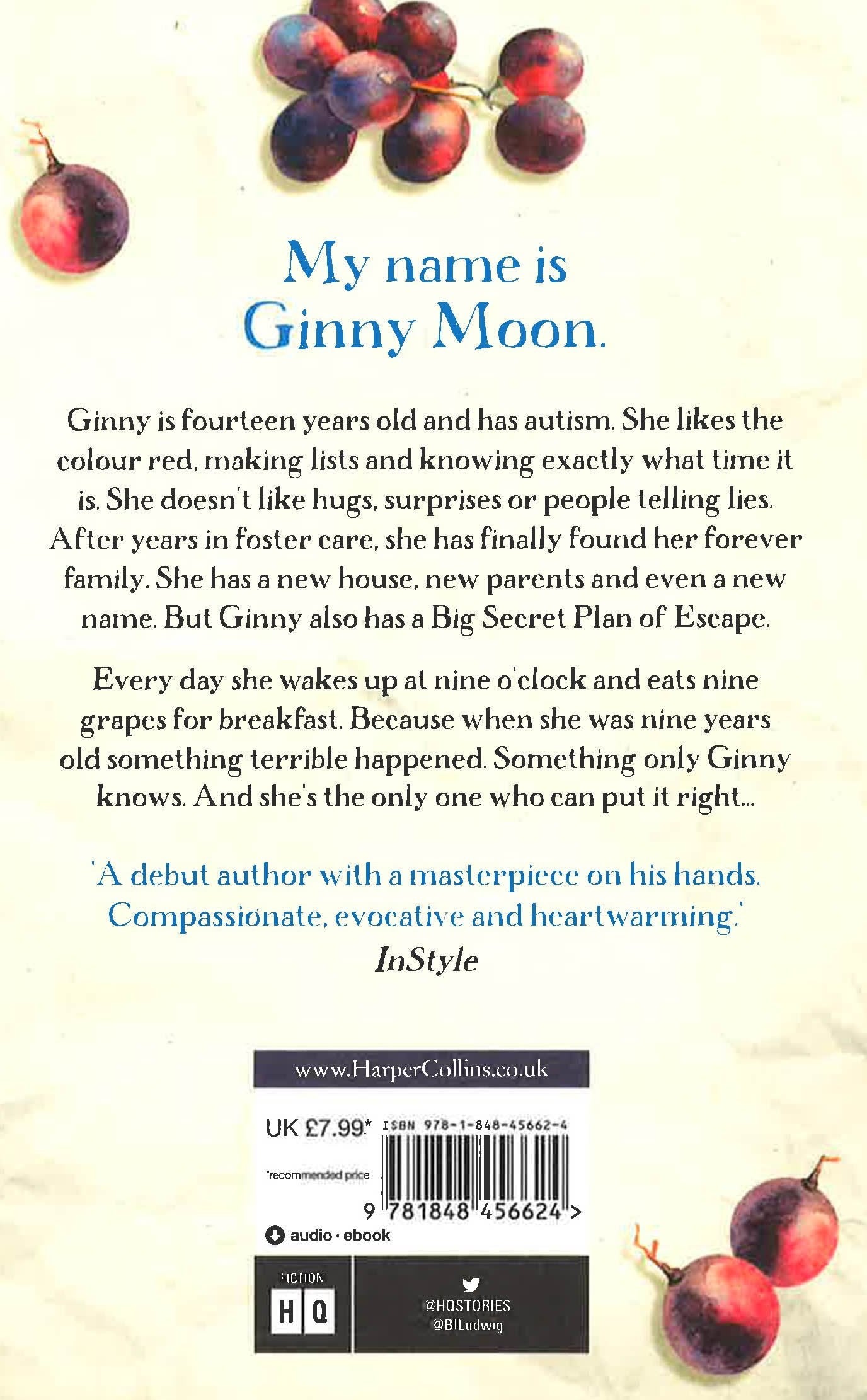 Brilliant' Graeme Simsion, author of The Rosie Project Ginny sees the world differently. Now you will too. 'Funny and wildly moving' Daily Mail My name is Ginny Moon. Ginny is fourteen years old and has autism. She likes the colour red, making lists and knowing exactly what time it is. She doesn't like hugs, surprises or people telling lies. After years in foster care, she has finally found her forever family. She has a new house, new parents and even a new name. But Ginny also has a Big Secret Plan of Escape. Every day she wakes up at nine o'clock and eats nine grapes for breakfast. Because when she was nine years old something terrible happened. Something only Ginny knows. And she's the only one who can put it right... The Original Ginny Moon is a poignant story of love and family, inspired by the author's own experiences. Perfect for fans of A Boy Made of Blocks and Shtum.
