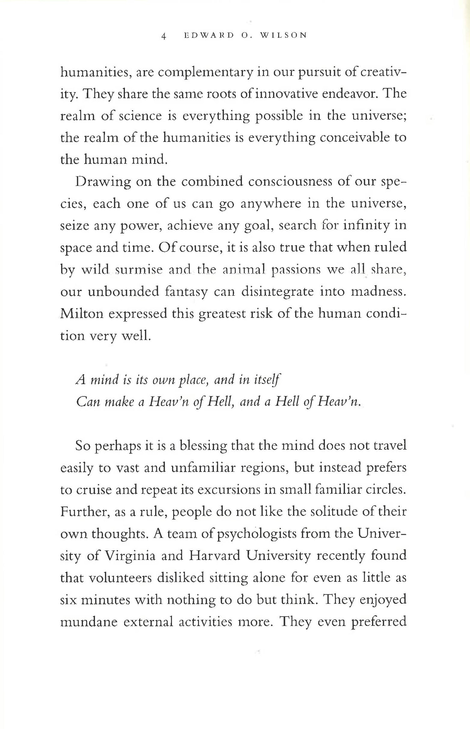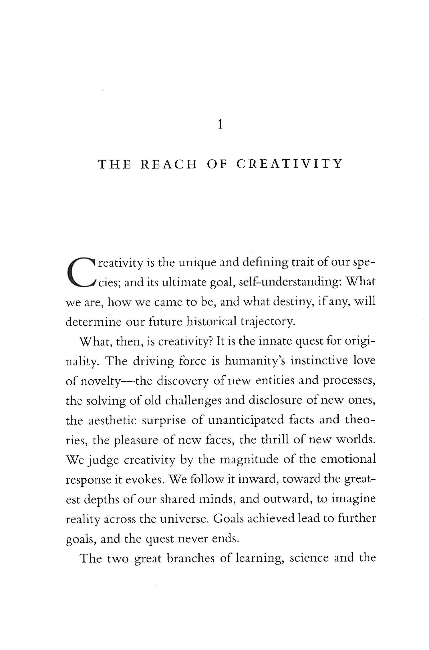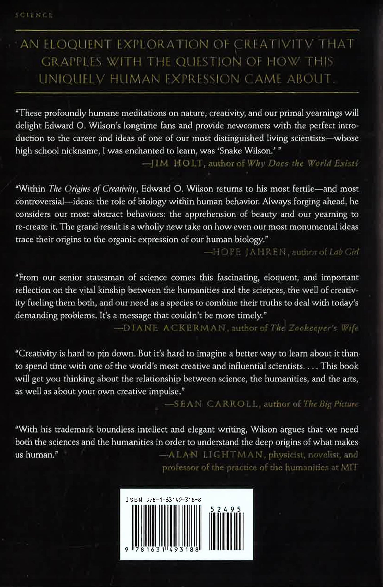 In this profound and lyrical book, one of our most celebrated biologists offers a sweeping examination of the relationship between the humanities and the sciences: what they offer to each other, how they can be united, and where they still fall short. Both endeavours, Edward O. Wilson reveals, have their roots in human creativity-the defining trait of our species. Reflecting on the deepest origins of language, storytelling, and art, Wilson demonstrates how creativity began not ten thousand years ago, as we have long assumed, but over one hundred thousand years ago in the Paleolithic age. Chronicling this evolution of creativity from primate ancestors to humans, The Origins of Creativity shows how the humanities, spurred on by the invention of language, have played a largely unexamined role in defining our species. And in doing so, Wilson explores what we can learn about human nature from a surprising range of creative endeavors-the instinct to create gardens, the use of metaphors and irony in speech, and the power of music and song. Our achievements in science and the humanities, Wilson notes, make us uniquely advanced as a species, but also give us the potential to be supremely dangerous, most worryingly in our abuse of the planet. The humanities in particular suffer from a kind of anthropomorphism, encumbered by a belief that we are the only species among millions that seem to matter, yet Wilson optimistically reveals how researchers will have to address this parlous situation by pushing further into the realm of science, especially fields such as evolutionary biology, neuroscience, and anthropology. With eloquence and humanity, Wilson calls for a transformational "Third Enlightenment," in which the blending of these endeavors will give us a deeper understanding of the human condition and our crucial relationship with the natural world.