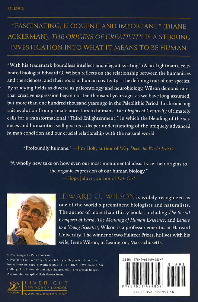 In a stirring exploration of human nature recalling his foundational work Consilience, Edward O. Wilson offers a "luminous" (Kirkus Reviews) reflection on the humanities and their integral relationship to science. Both endeavors, Wilson argues, have their roots in human creativity-the defining trait of our species. By studying fields as diverse as paleontology, evolution, and neurobiology, Wilson demonstrates that creative expression began not 10,000 years ago, as we have long assumed, but more than 100,000 years ago in the Paleolithic Age. A provocative investigation into what it means to be human, The Origins of Creativity reveals how the humanities have played an unexamined role in defining our species. With the eloquence, optimism, and pioneering inquiry we have come to expect from our leading biologist, Wilson proposes a transformational "Third Enlightenment" in which the blending of science and humanities will enable a deeper understanding of our human condition, and how it ultimately originated.