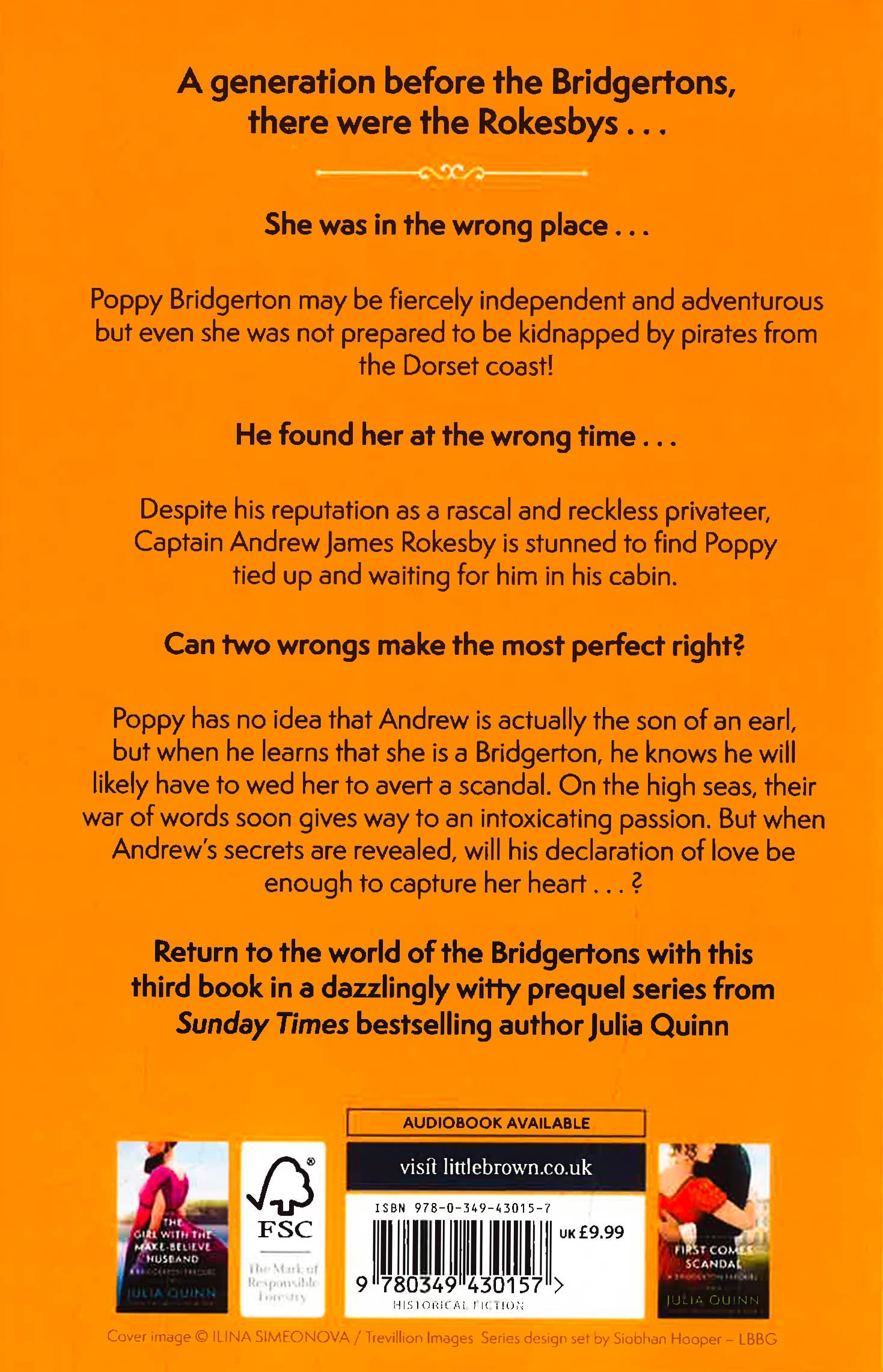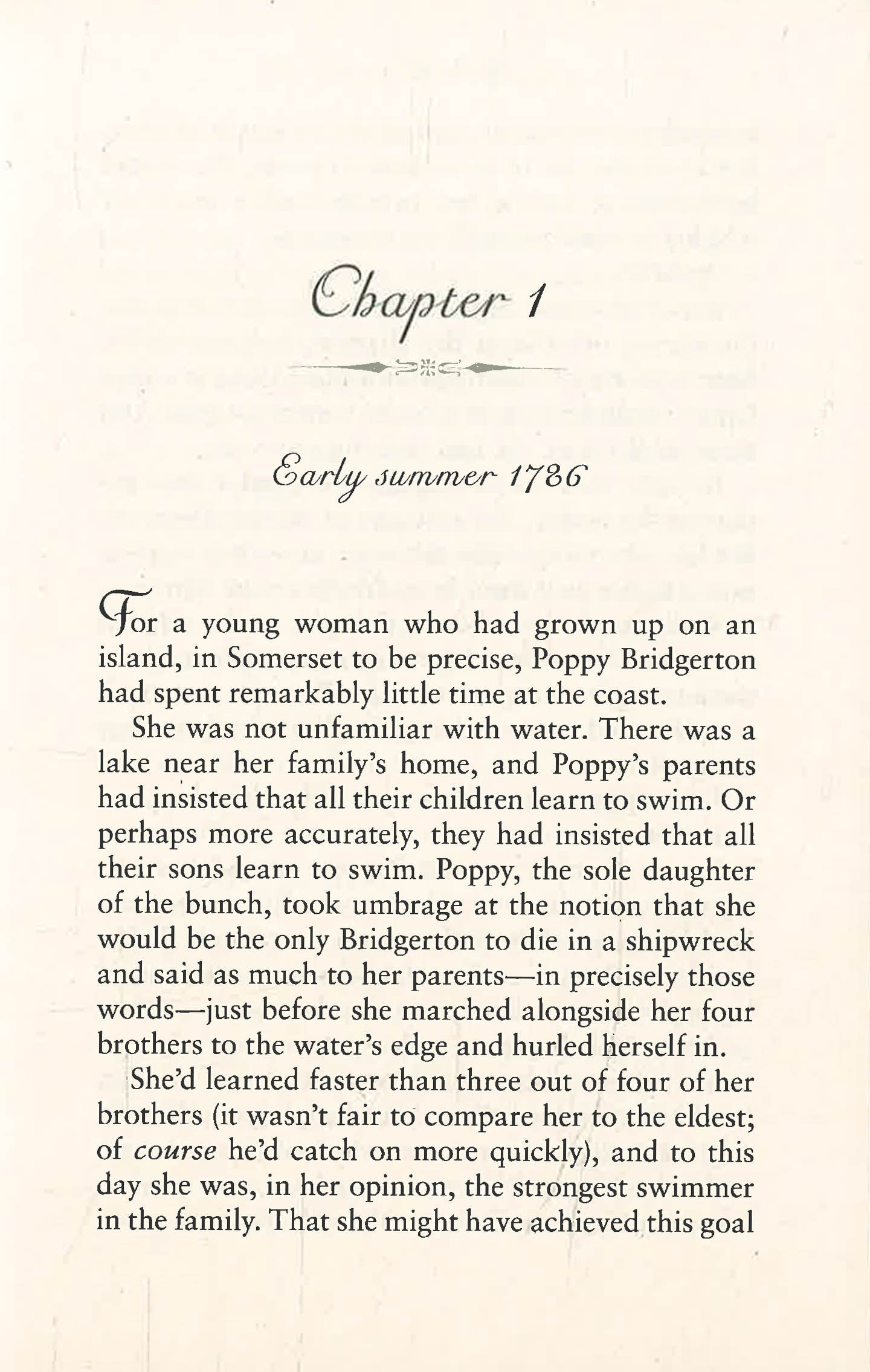 When Andrew learns that she is a Bridgerton, he knows he will likely have to wed her to avert a scandal—though Poppy has no idea that he is the son of an earl and neighbor to her aristocratic cousins in Kent. On the high seas, their war of words soon gives way to an intoxicating passion. But when Andrew’s secret is revealed, will his declaration of love be enough to capture her heart…?