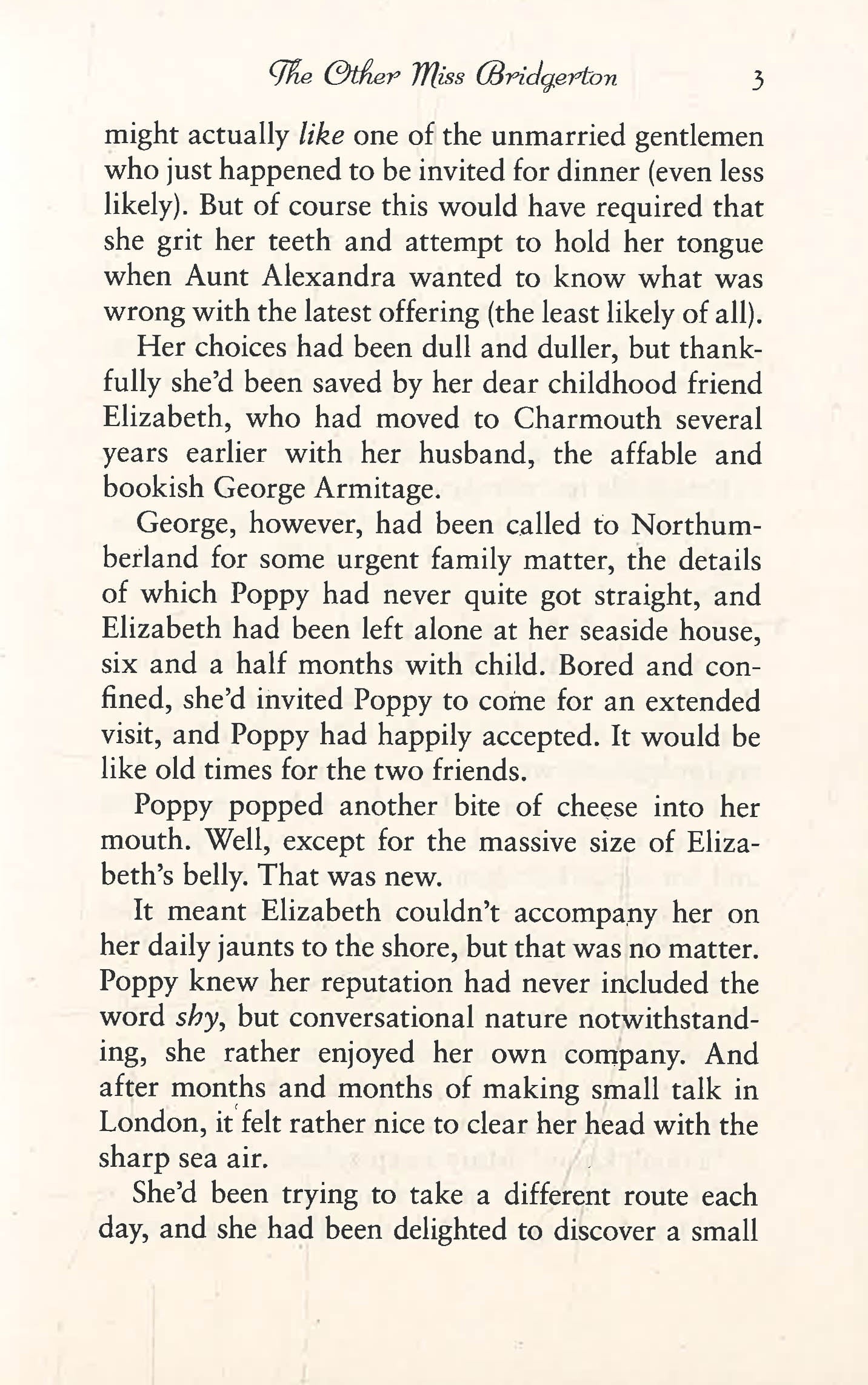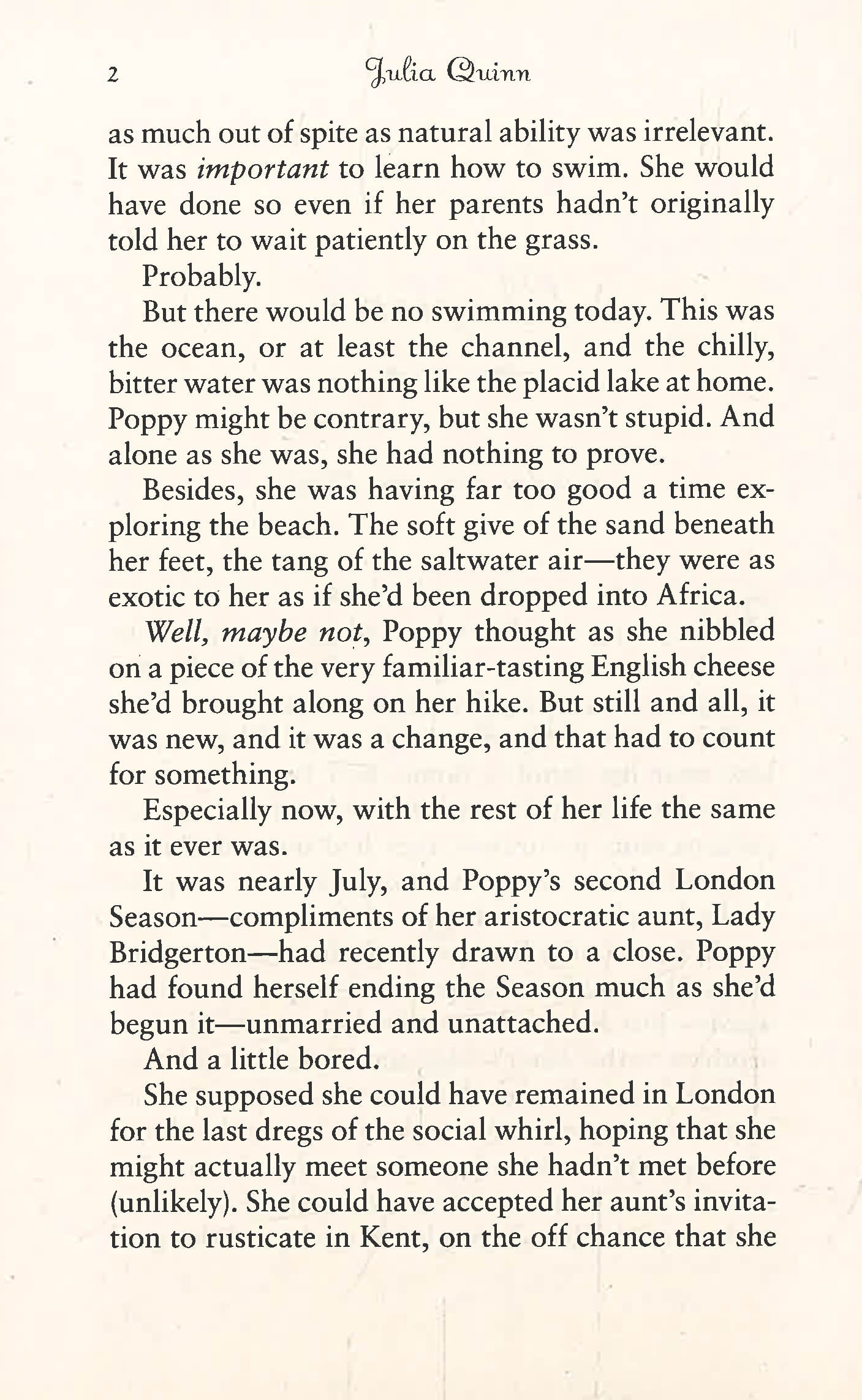 Fiercely independent and adventurous, Poppy Bridgerton will only wed a suitor whose keen intellect and interests match her own. Sadly, none of the fools from her London season qualify. While visiting a friend on the Dorset coast, Poppy is pleasantly surprised to discover a smugglers’ hideaway tucked inside a cave. But her delight turns to dismay when two pirates kidnap her and take her aboard a ship, leaving her bound and gagged on the captain’s bed…
