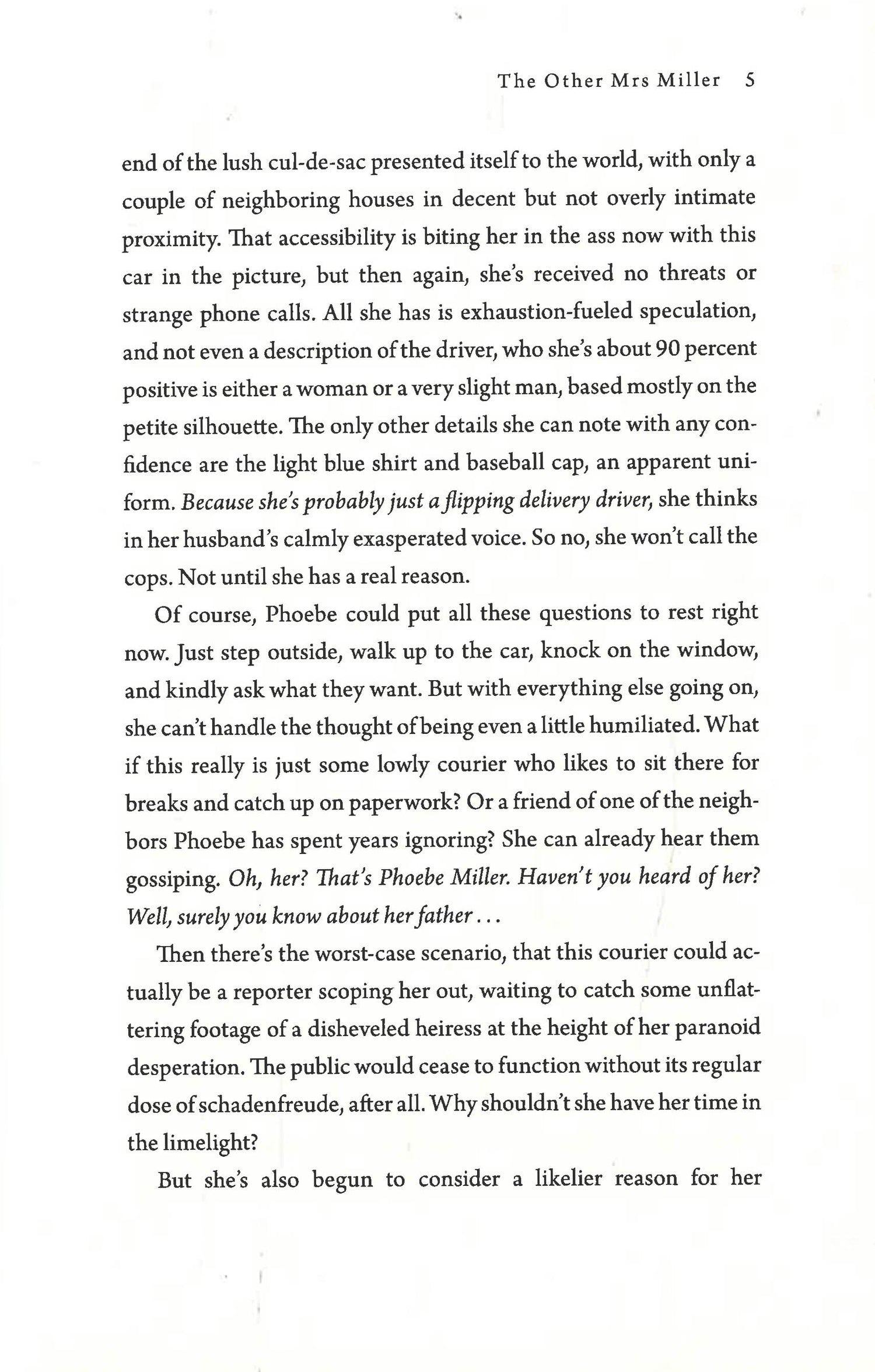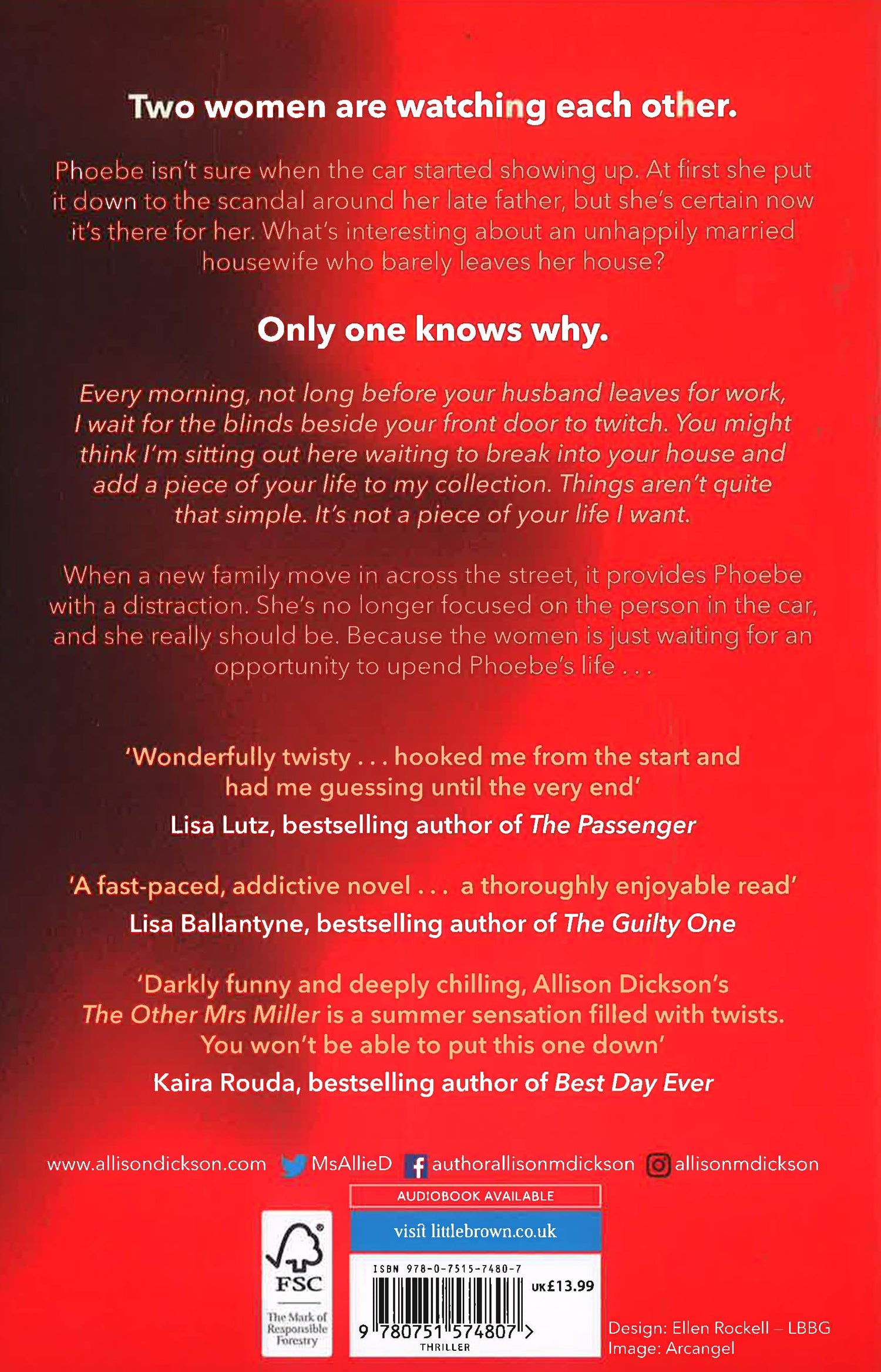 Meet the Millers'Anyone who enjoys thrillers NEEDS to read this book!' *****'I practically threw the book across the room when I read THAT twist.' Heidi Perks, bestselling author of Now You See Her'Allison Dickinson has a sure fire hit on her hands' *****'Will take your breath away' CHRISTINA DALCHER, bestselling author of Vox'I loved it!!! Totally mind blowing. This is must read for all thriller lovers' *****'A fast-paced, addictive novel' LISA BALLANTYNE, author of The Guilty One'Kept me up way past my bedtime. I loved every dark and twisted page' ***** ***SOON TO BE A MAJOR TV SERIES*** _______________ Two women are watching each other. Phoebe isn't sure when the car started showing up. At first she put it down to the scandal around her late father, but she's certain now it's there for her. What's interesting about an unhappily married housewife, who barely leaves her house? Only one knows why. Every morning, not long before your husband leaves for work, I wait for the blinds beside your front door to twitch. You might think I'm sitting out here waiting to break into your house and add a piece of your life to my collection. Things aren't quite that simple. It's not a piece of your life I want. When a new family move in across the street, it provides Phoebe with a distraction. But with her head turned she's no longer focused on the woman in the car. And Phoebe really should be, because she's just waiting for an opportunity to upend Phoebe's life..._______________ THE OTHER MRS MILLER stands among the very best and is perfect for anyone who loved The Couple Next Door by Shari Lapena The Woman in the Window by A.J. Finn The Wife Between Us by Greer Hendricks & Sarah PekkanenMy Lovely Wife by Samantha Downing_______________More praise for The Other Mrs Miller...'A twisty suspense novel that will keep you guessing until its final pages' THE HERALD 'Deliciously devious' CHANDLER BAKER, author of Whisper Network 'Had me guessing until the very end' LISA LUTZ, author of The Passenger 'A thrilling page-turner!' GINA LAMANNA, author of Pretty Guilty Women'Darkly funny and deeply chilling, Allison Dickson's The Other Mrs. Miller is a summer sensation filled with twists. You won't be able to put this one down' KAIRA ROUDA, bestselling author of Best Day 'Stunning... As disconcerting as it is unexpected' PUBLISHERS WEEKLY'A Hitchcock-ian thriller from a new voice worth noting' KIRKUS REVIEW