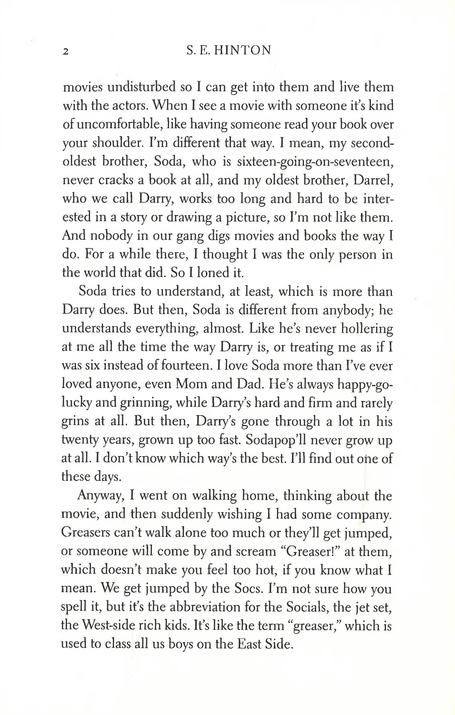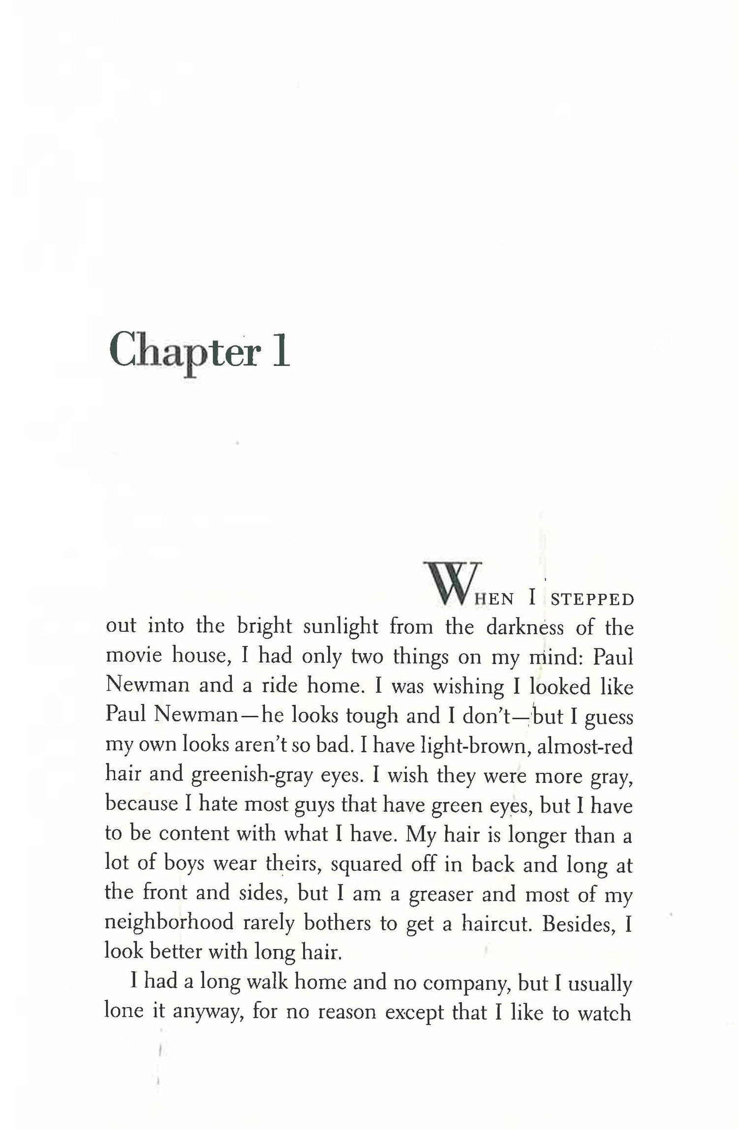 No one ever said life was easy. But Ponyboy is pretty sure that he's got things figured out. He knows that he can count on his brothers, Darry and Sodapop. And he knows that he can count on his friends—true friends who would do anything for him, like Johnny and Two-Bit. But not on much else besides trouble with the Socs, a vicious gang of rich kids whose idea of a good time is beating up on “greasers” like Ponyboy. At least he knows what to expect—until the night someone takes things too far.