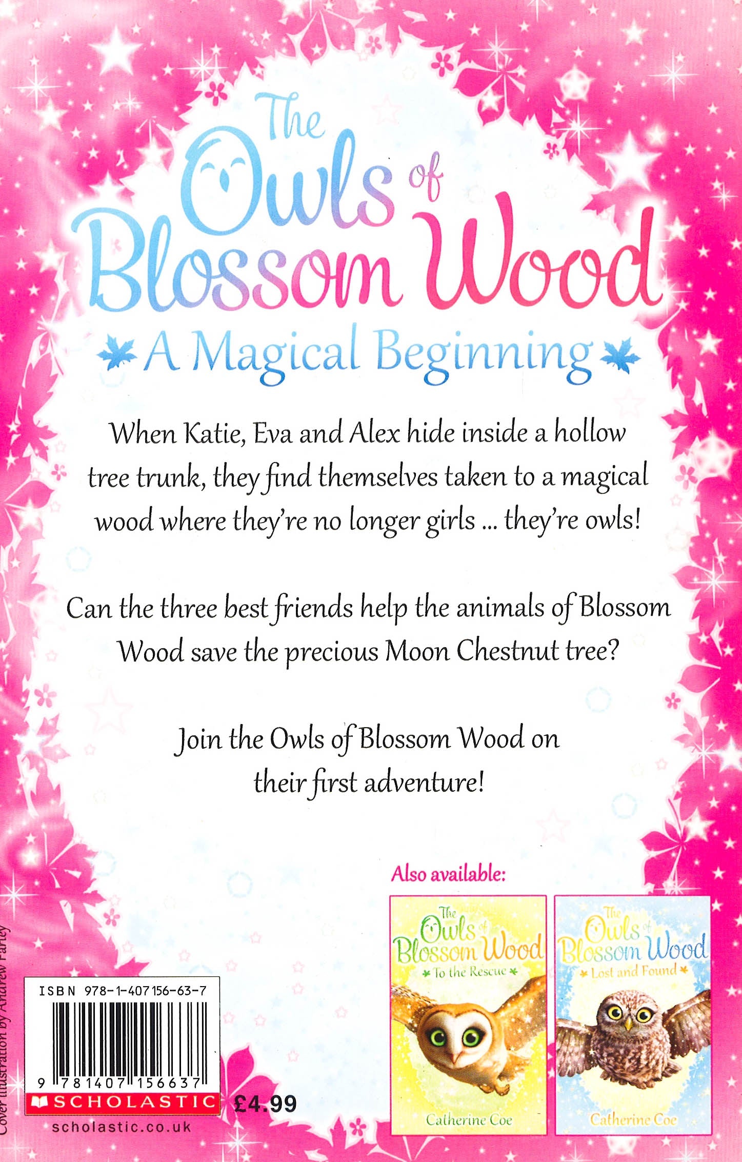 A gorgeous animal series set in the beautiful BlossomWood - where children turn into magical creatures.Katie, Eva and Alex know a secret - whenthey hide inside a hollow tree trunk at the bottom of Katie's garden,they find themselves whisked away to a magical woods alive withanimals, where they're no longer girls but owls!Can the three best friends help the animals of Blossom Wood savethe precious Moon Chestnut tree?