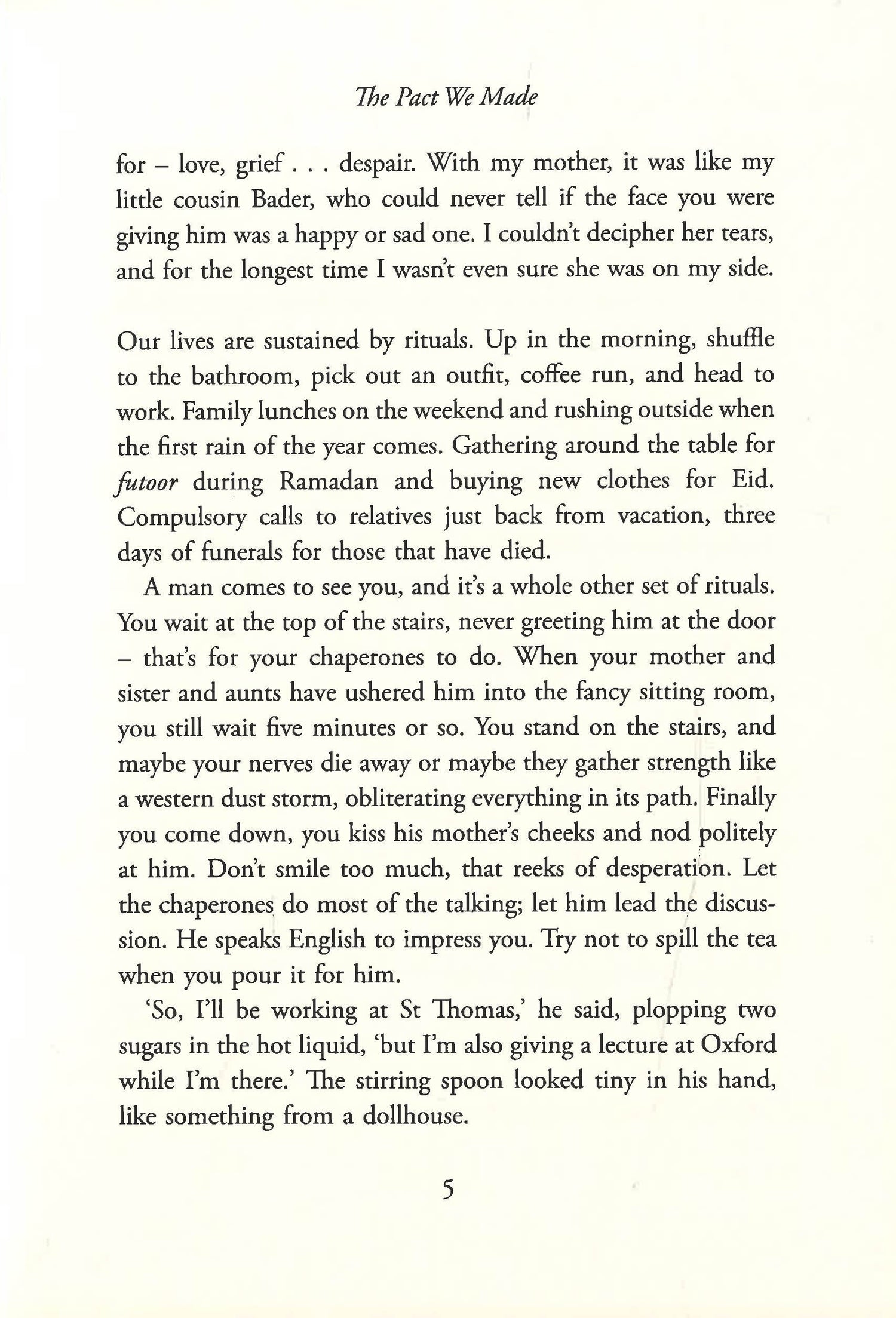 How could I explain to her that nothing in my life felt real? That in a country like Kuwait, where everyone knew everything about each other, the most monumental thing to ever happen to me was buried and covered over? For the sake of my reputation, my future, my sister's and cousins; the family honor sat on my little shoulders, so no-one could ever know.' Dahlia has two lives. In one, she is a young woman with a good job, great friends and a busy social life. In the other, she is an unmarried daughter living at home, struggling with a burgeoning anxiety disorder and a deeply buried secret: a violent betrayal too shameful to speak of. With her thirtieth birthday fast-approaching, pressure from her mother to accept a marriage proposal begins to strain the family. As her two lives start to collide and fracture, all Dahlia can think of is escape: something that seems impossible when she can't even leave the country without her father's consent. But what if Dahlia does have a choice? What if all she needs is the courage to make it? Set in contemporary Kuwait, The Pact We Made is a deeply affecting and timely debut about family, secrets and one woman's search for a different life.