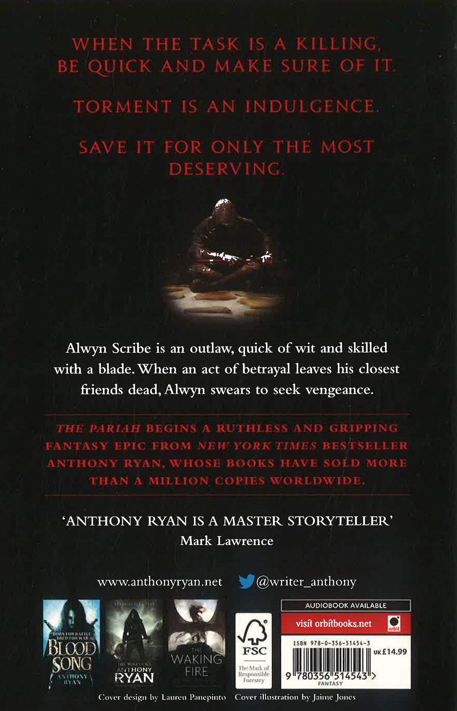 'A gritty, heart-pounding tale of betrayal and bloody vengeance' John GwynneWhen the task is a killing, be quick and make sure of it.Torment is an indulgence.Save it for only the most deserving. Born in the troubled kingdom of Albermaine, Alwyn Scribe is raised as an outlaw. Quick of wit and deft with a blade, Alwyn is content with the comradeship of his fellow thieves. Yet an act of betrayal sets him on a new path of blood and vengeance, which leads him to a soldier's life in the king's army. Fighting under the command of Lady Evadine Courlain, a noblewoman beset by visions of a demonic apocalypse, Alwyn must survive war and the deadly intrigues of the nobility if he hopes to claim his vengeance. But as human and arcane forces gather to oppose Evadine's rise, Alwyn faces a choice: can he be a warrior, or will he always be an outlaw?The Pariah begins a dark and bloody new fantasy epic from New York Times bestseller Anthony Ryan, whose books have sold more than a million copies worldwide.Praise for Anthony Ryan'A master storyteller' Mark Lawrence'Robin Hobb meets Joe Abercrombie. This is fantasy with a totally legendary feel' Fantasy Book Review 'Everything a fantasy fan could ever wish for' Booknest 'Fantastic storytelling' Novel Notions