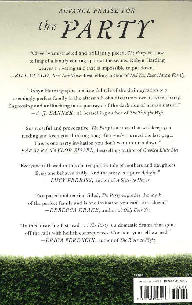 In this stunning and provocative domestic drama about a sweet sixteen birthday party that goes horribly awry, a wealthy family in San Francisco finds their picture-perfect life unraveling, their darkest secrets revealed, and their friends turned to enemies. One invitation. A lifetime of regrets. Sweet sixteen. It's an exciting coming of age, a milestone, and a rite of passage. Jeff and Kim Sanders plan on throwing a party for their daughter, Hannah--a sweet girl with good grades and nice friends. Rather than an extravagant, indulgent affair, they invite four girls over for pizza, cake, movies, and a sleepover. What could possibly go wrong? But things do go wrong, horrifically so. After a tragic accident occurs, Jeff and Kim's flawless life in a wealthy San Francisco suburb suddenly begins to come apart. In the ugly aftermath, friends become enemies, dark secrets are revealed in the Sanders' marriage, and the truth about their perfect daughter, Hannah, is exposed. If you loved Liane Moriarty's and HBO's Big Little Lies, you'll love The Party by Robyn Harding. This fast paced book exposes how even the most perfect of families can be shadowed by lies and betrayals. This is one page-turner you're going to want to bring with you on vacation, to the beach, and add to your nightstand to be read. *This book may have remainder mark*
