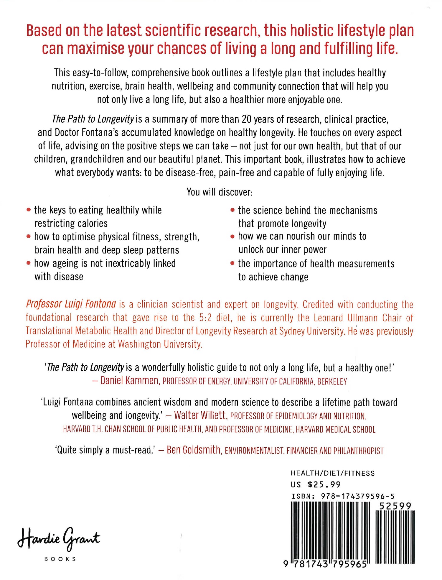 The Path to Longevity is a summary of more than 20 years of research, clinical practice and Professor Luigi Fontana's accumulated knowledge on healthy longevity, using an evidence-based approach. Rather than trying to treat sick people with medicine, Professor Luigi Fontana set out to discover how we can avoid the chronic illnesses in our society, and live long, healthy lives.