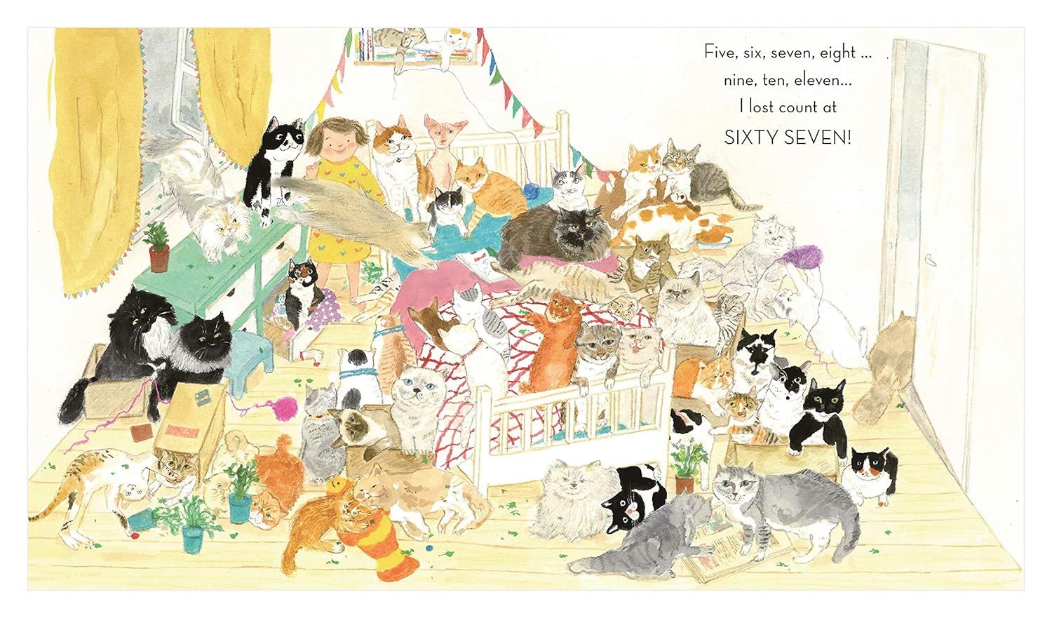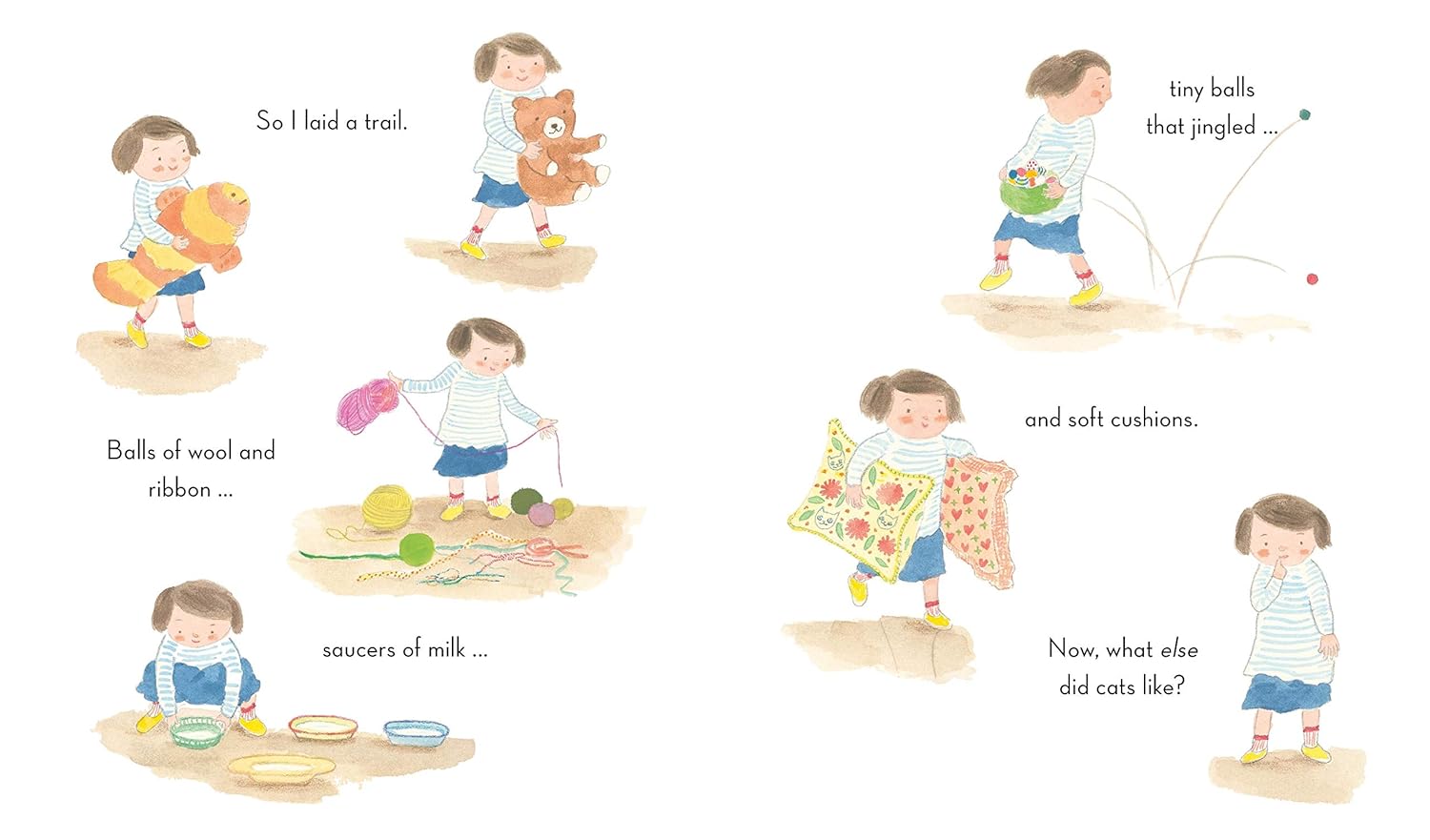 The leading lady of this tale longs for a pet cat to cuddle and call her own – a furry fluffball, just like the one in her book. So, after studying her grandma’s cat, Hector, she lays a trail with all the things that she knows cats love – balls of wool, saucers of milk, cardboard boxes and catnip aplenty. And then she waits for a cat to come…