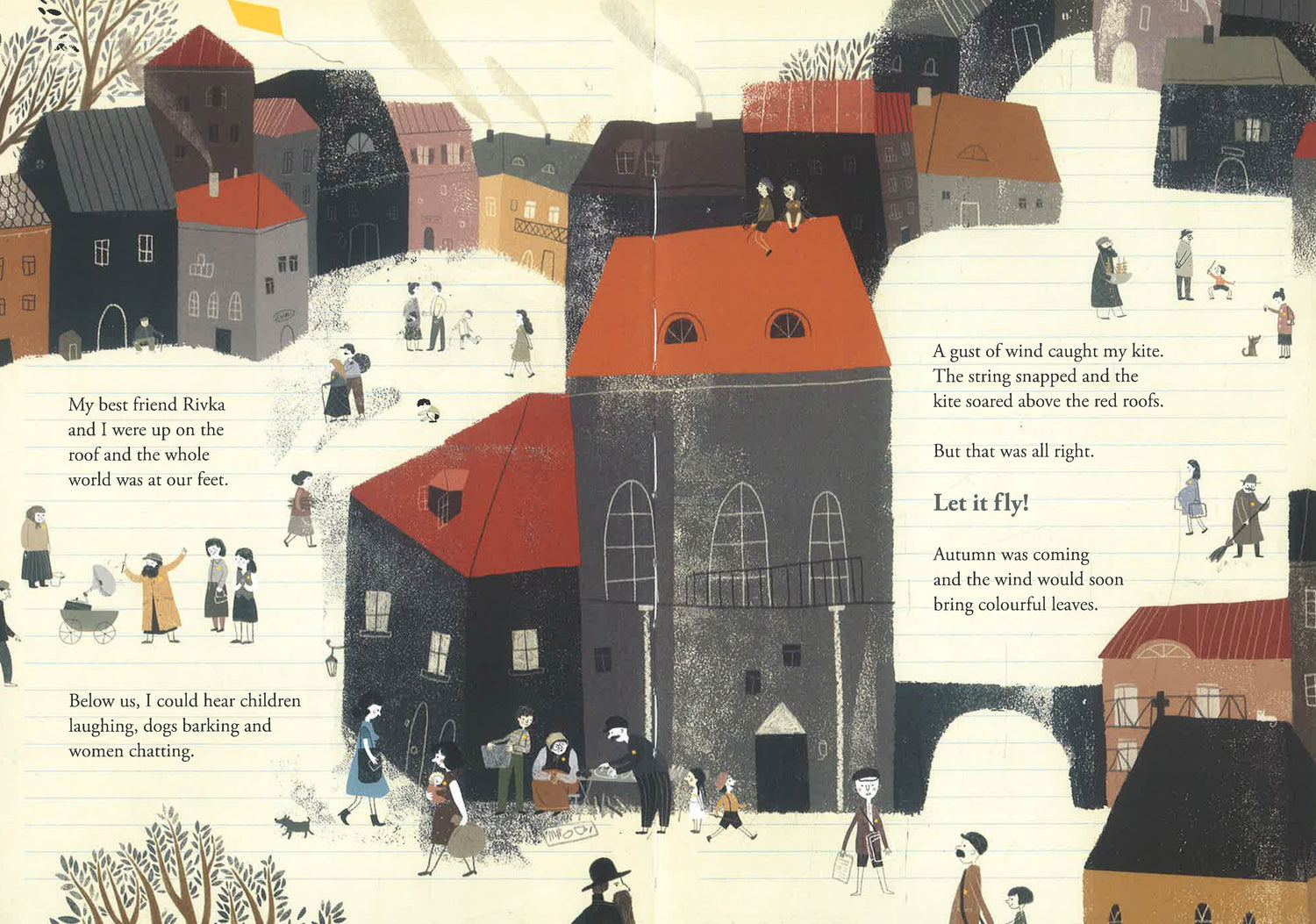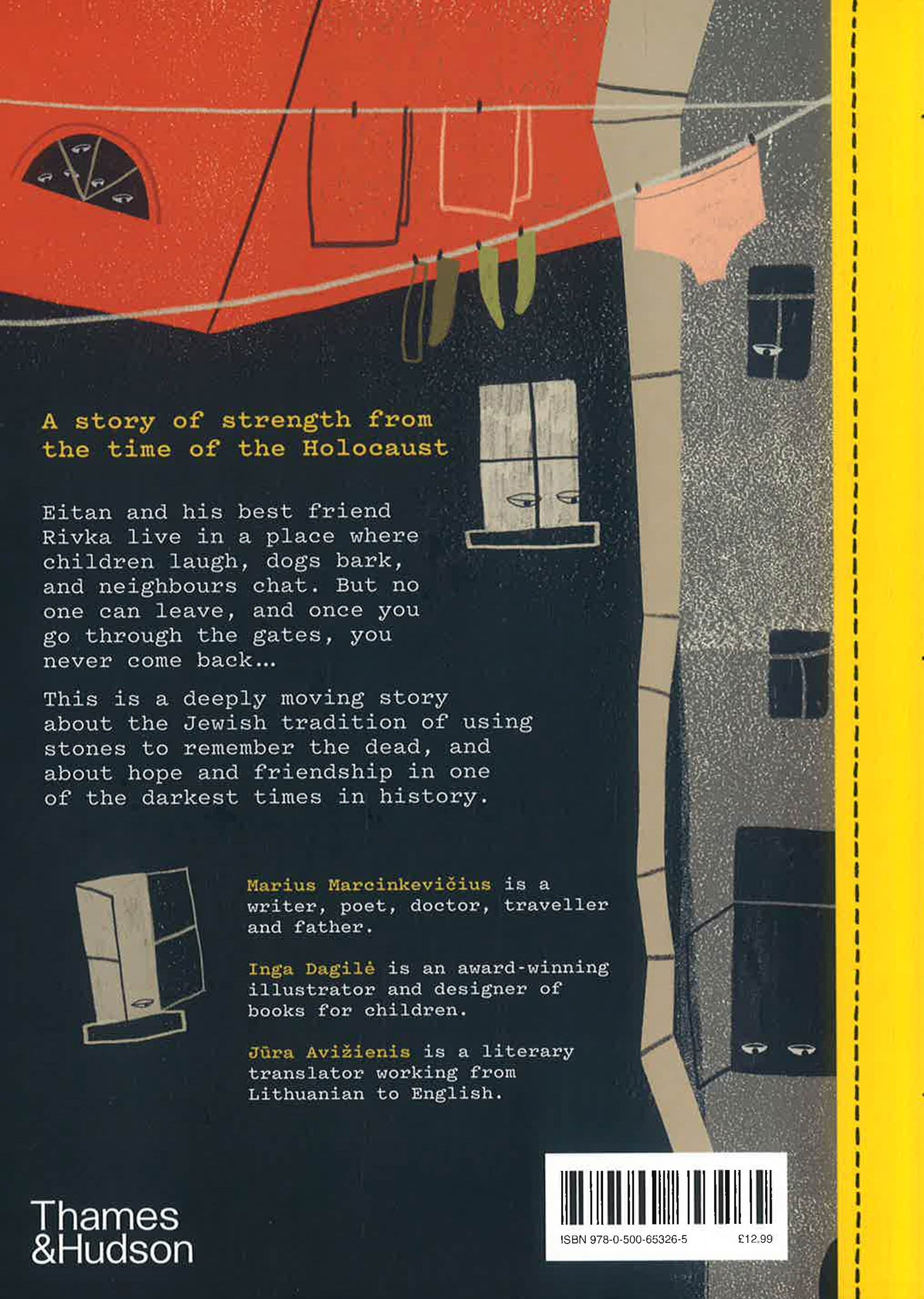 This picture book is light in appearance only―in fact, its pages unfold a story about one of the darkest stages of human history―the Holocaust. Marcinkevicius lays out life in the ghetto in spare sentences, highlighting the complexities of the human condition: although the block is surrounded by a wall and guarded by soldiers, you can climb on the roof and dream there; although families are taken out of the ghetto one by one and do not return, it does not extinguish people’s hope and culture: performances are held in the theater, voices echo in the streets, neighbors gather, children and their pets play.