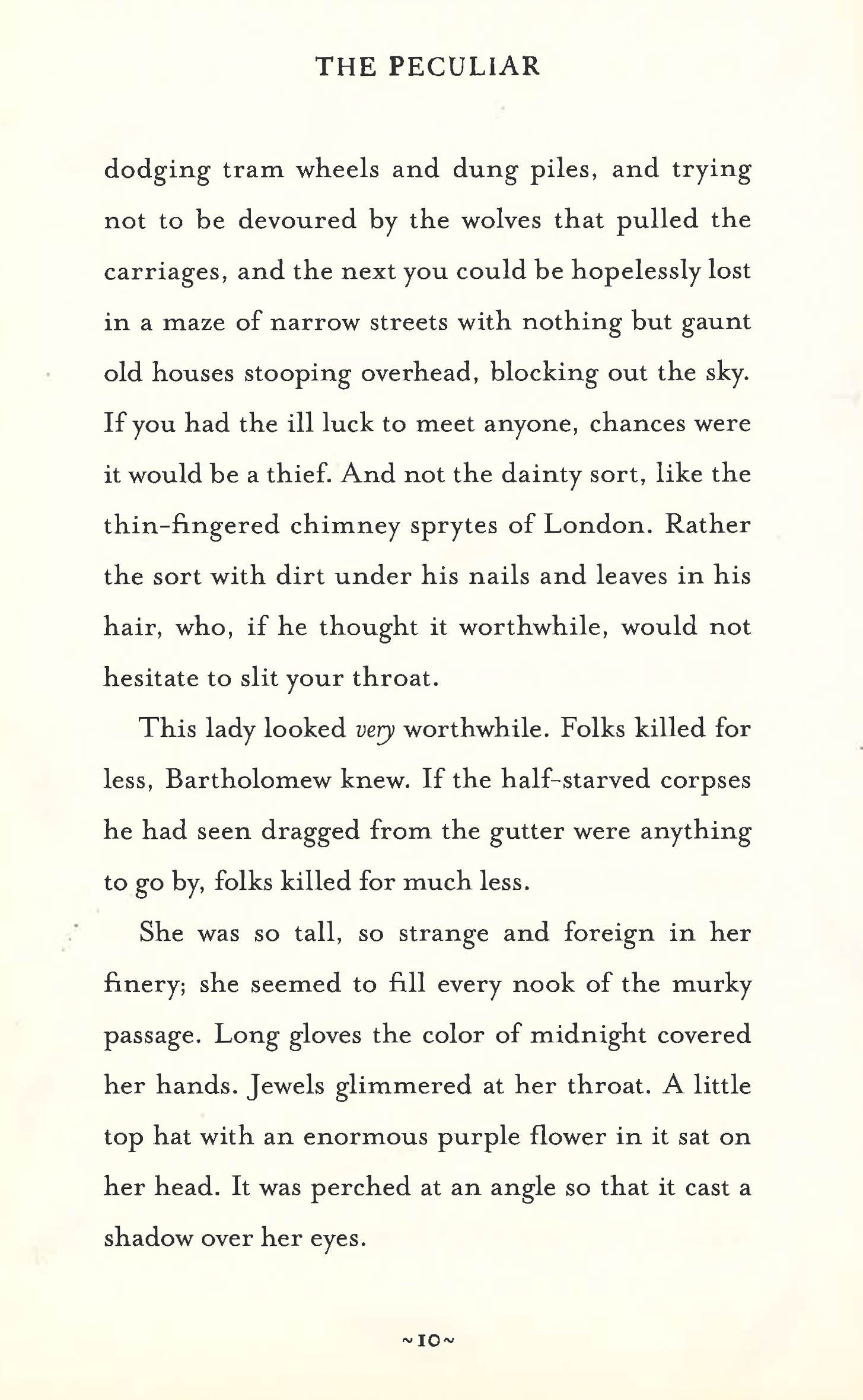 Don't get yourself noticed and you won't get yourself hanged. In the faery slums of Bath, Bartholomew Kettle and his sister Hettie live by these words. Bartholomew and Hettie are changelings - Peculiars - and neither faeries nor humans want anything to do with them. One day a mysterious lady in a plum-colored dress comes gliding down Old Crow Alley. Bartholomew watches her through his window. Who is she? What does she want? And when Bartholomew witnesses the lady whisking away, in a whirling ring of feathers, the boy who lives across the alley - Bartholomew forgets the rules and gets himself noticed. First he's noticed by the lady in plum herself, then by something darkly magical and mysterious, by Jack Box and the Raggedy Man, by the powerful Mr. Lickerish . . .and by Arthur Jelliby, a young man trying to slip through the world unnoticed, too, and who, against all odds, offers Bartholomew friendship and a way to belong. Part murder mystery, part gothic fantasy, part steampunk adventure, The Peculiar is Stefan Bachmann's riveting, inventive, and unforgettable debut novel.