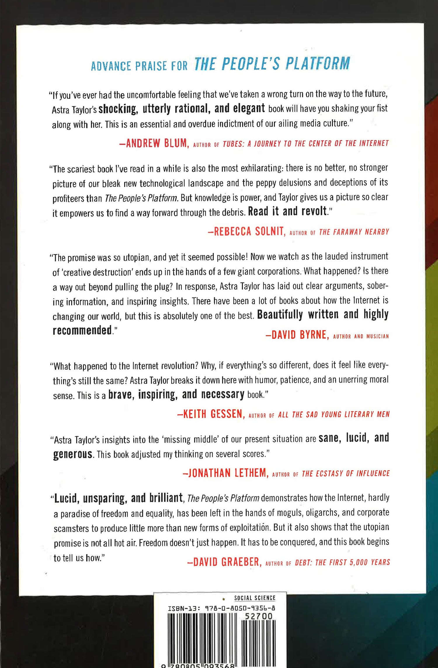 From a cutting-edge cultural commentator, a bold and brilliant challenge to cherished notions of the Internet as the great leveler of our ageThe Internet has been hailed as an unprecedented democratizing force, a place where everyone can be heard and all can participate equally. But how true is this claim? In a seminal dismantling of techno-utopian visions, "The People's Platform" argues that for all that we "tweet" and "like" and "share," the Internet in fact reflects and amplifies real-world inequities at least as much as it ameliorates them. Online, just as off-line, attention and influence largely accrue to those who already have plenty of both.What we have seen so far, Astra Taylor says, has been not a revolution but a rearrangement. Although Silicon Valley tycoons have eclipsed Hollywood moguls, a handful of giants like Amazon, Apple, Google, and Facebook remain the gatekeepers. And the worst habits of the old media model--the pressure to seek easy celebrity, to be quick and sensational above all--have proliferated on the web, where "aggregating" the work of others is the surest way to attract eyeballs and ad revenue. When culture is "free," creative work has diminishing value and advertising fuels the system. The new order looks suspiciously like the old one. We can do better, Taylor insists. The online world does offer a unique opportunity, but a democratic culture that supports diverse voices and work of lasting value will not spring up from technology alone. If we want the Internet to truly be a people's platform, we will have to make it so.