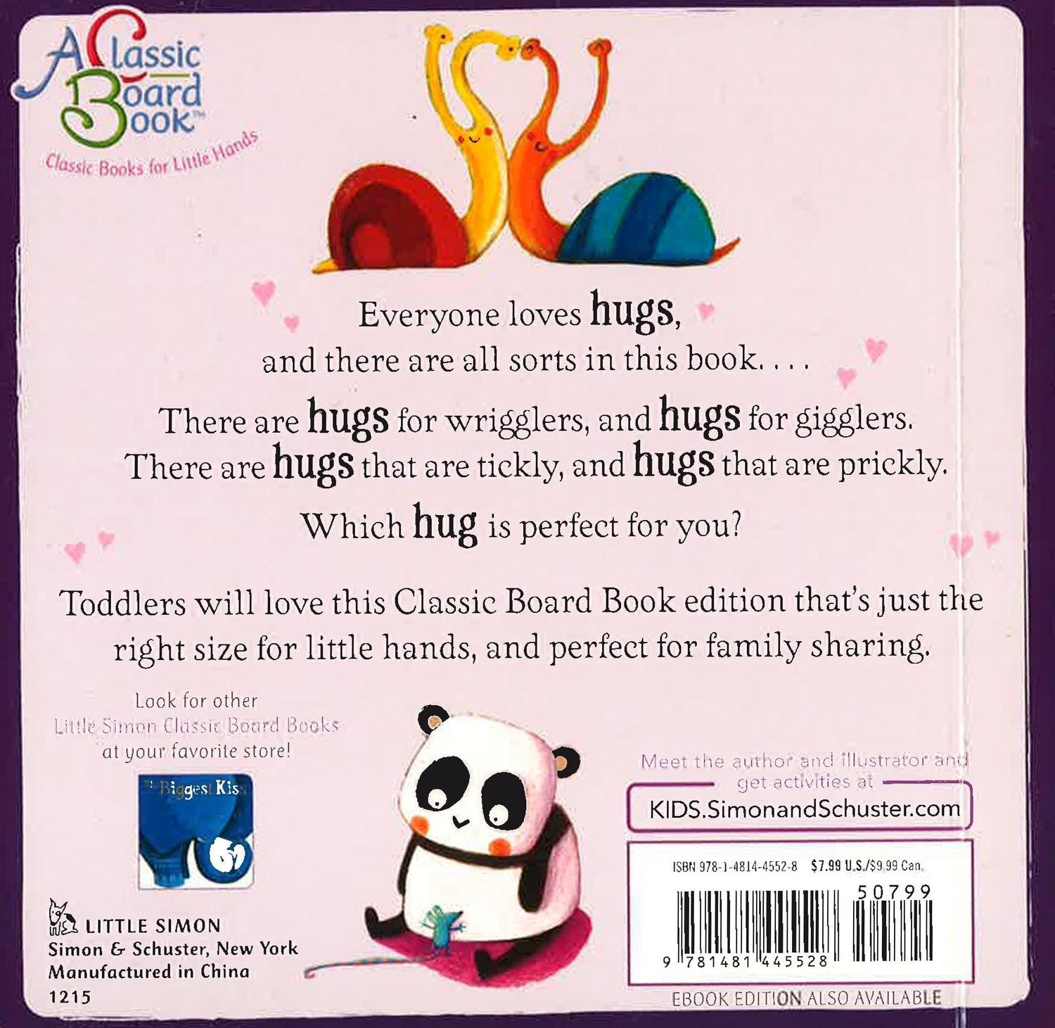 There's a special hug for everyone in this warm and cozy follow-up to The Biggest Kiss that's now available as a Classic Board Book! There are hugs for wrigglers, and hugs for gigglers. Hugs that are tickly, and hugs that are prickly... But none is exactly the right hug for me! I'm out to find the perfect kind. This fabulous feel-good picture book is bursting with the cuddliest, snuggliest, most perfect hugs. With darling animals on every page, even the youngest readers won't be able to resist this new Classic Board Book that's just the right size for little hands!