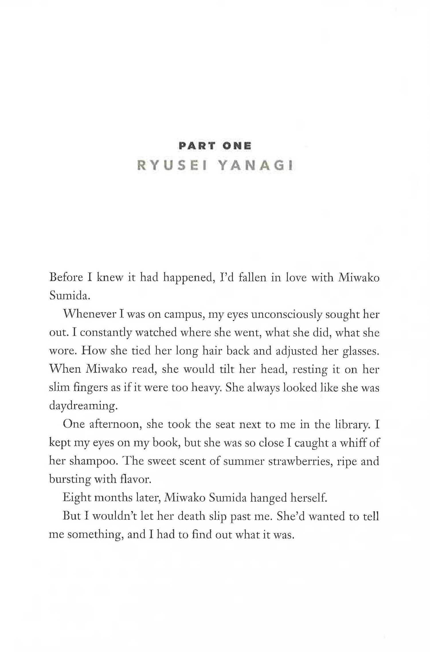 From the critically acclaimed author of Rainbirds comes a novel of tragedy anddark histories set in Japan. University sophomore Miwako Sumida has hanged herself, leaving those closest to her reeling. In the months before her suicide, she was hiding away in a remote mountainside village, but what, or whom, was she running from?