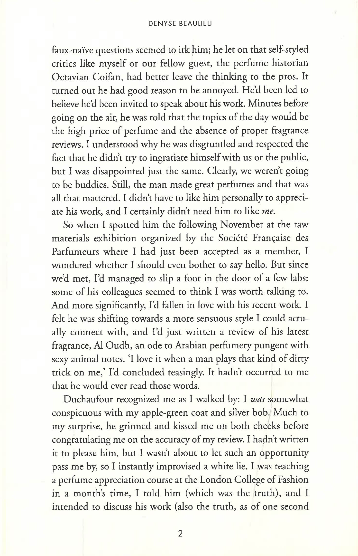 Why couldn't I be a perfumer's muse? I've come such a long way in the realm of scent. In fact, I was never really meant to poke my nose into it ...' The Perfume Lover by Denyse Beaulieu is an intimate journey into the mystery of scent. Why couldn't I be a perfumer's muse? I've come such a long way in the realm of scent. In fact, I was never really meant to poke my nose into it ...' The Perfume Lover by Denyse Beaulieu is an intimate journey into the mystery of scent. What if the most beautiful night in your life inspired a fragrance? Denyse Beaulieu is a respected fragrance writer; it is her world, her love, her life. When she was growing up, perfume was forbidden in her house, spurring a childhood curiosity that went on to become an intellectual and sensual passion. It is this passion she pursued all the way to Paris, where she now lives, and entered the secretive world of the perfume industry. But little did she know that it would lead her to achieve a fragrance lover's wildest dream ... When Denyse tells a famous perfumer of a sensual night spent in Seville under an orange tree in full blossom, wrapped in the arms of a beautiful young man, the story stirs his imagination and together they create a scent that captures the essence of that night. This is the story of that perfume. As the unique creative collaboration unfolds, the perfume-in-progress conjures intimate memories, leading Beaulieu to make sense of her life through scents. Throughout, she weaves the evocative history of perfumery into her personal journey, in an intensely passionate voice: the masters and the masterpieces; the myths and the myth-busting, down to the molecular mysteries that weld our flesh to flowers... The Perfume Lover is an unprecedented account of the creative process that goes into composing a fragrance, and a uniquely candid insider's view into the world and history of fragrance. Your world will never smell the same.