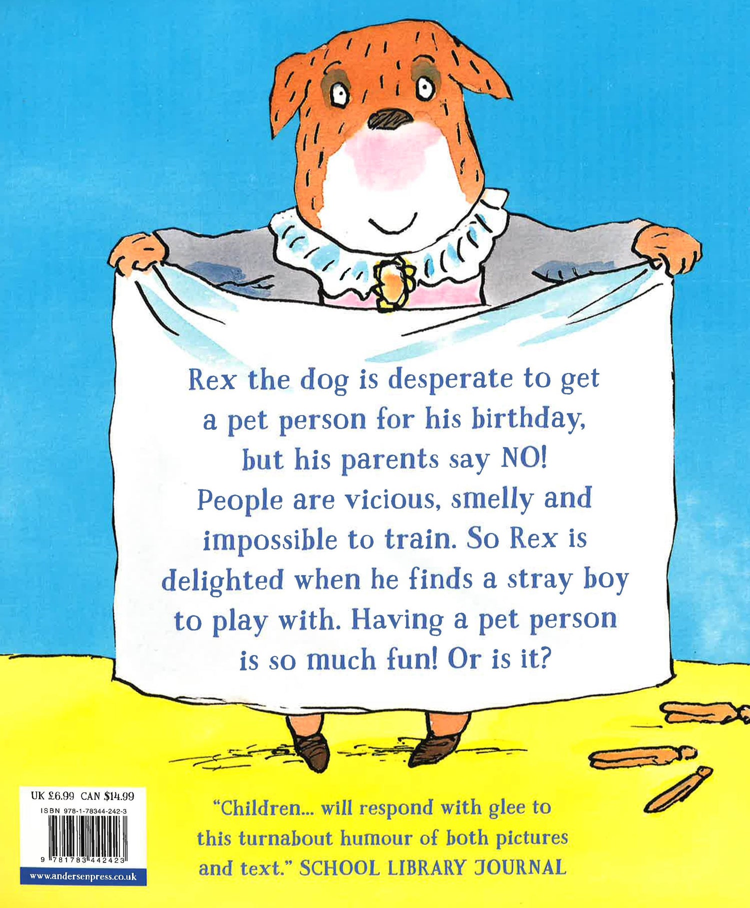 Rex, the dog, is desperate to get a pet person for his birthday, but his parents say NO! Everyone knows that people are vicious, smelly and impossible to train. So Rex is delighted when he finds a stray boy to play with. Having a pet person is just so much fun! Or is it. . . ? Join in the fun of the topsy-turvy world of The Pet Person in this hilarious tale from the award-winning partnership of Jeanne Willis and Tony Ross.