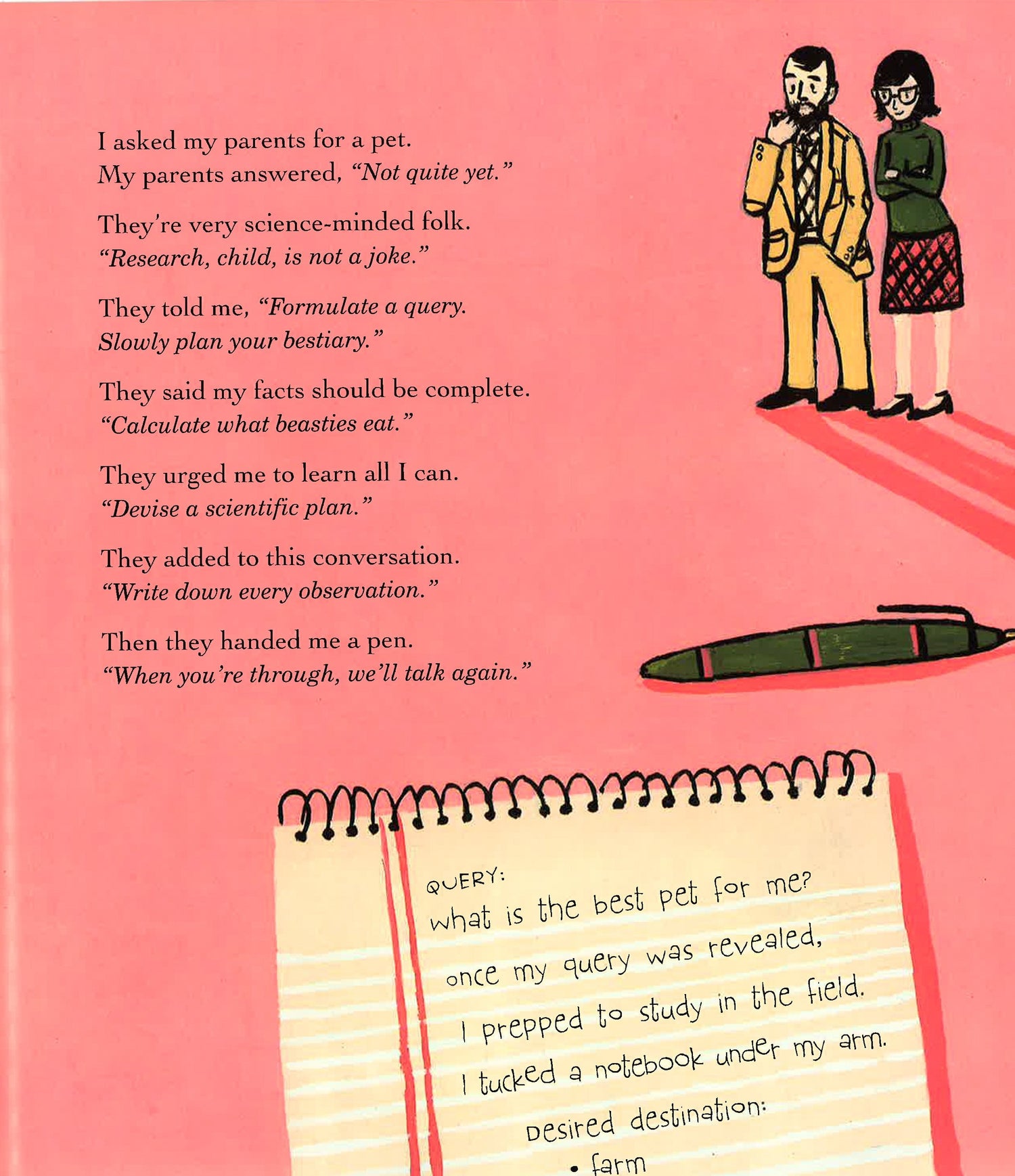 Embark on a methodical, meticulous, and hilarious quest for the perfect pet in this wickedly witty cautionary collection of pet poems. "If you're the type that oohs and aahs " "at furry faces, precious paws, " "the words ahead may be alarming: " "Animals aren't always charming." If you think you'd like a cute and cuddly pet, you may need to do some research. Formulate a query. Devise a scientific plan. And be sure to write down every observation of the animals you encounter. Join one budding young scientist as she catalogs the pros and pitfalls of potential pet ownership in this assortment of zany and relatable poems that will change the way you look at cuddly animals--and give you the giggles.