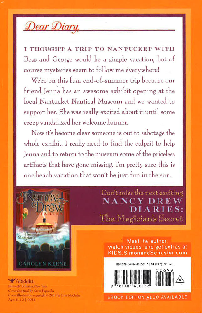 A dream trip to Nantucket turns into a nightmare in this seventh book of the Nancy Drew Diaries, a fresh approach to a classic series. Nancy, Bess, and George can't wait to start their trip to Nantucket. The three girls are there to visit Bess's family friend Jenna and go to the opening of an exhibit at the local whaling museum. Jenna's been working on the exhibit for months, but when the girls get to the museum, a threatening banner has replaced the welcome sign. Nancy's got plenty of potential suspects, but she's worried she won't be able to solve the case in time to save the opening. And as the threats increase in severity, she becomes more concerned about Jenna's safety than the ruined exhibit. Can Nancy find the culprit in time?