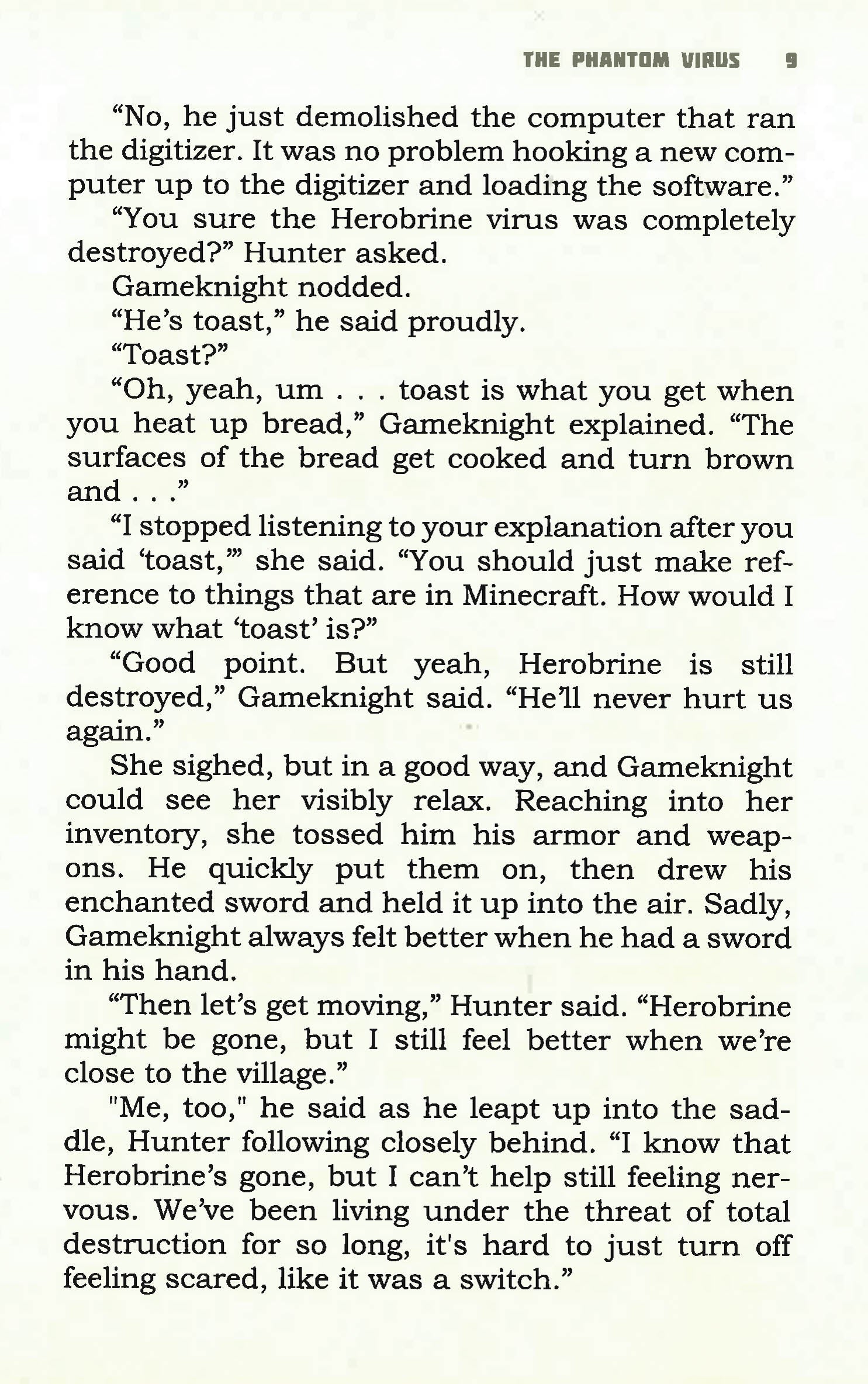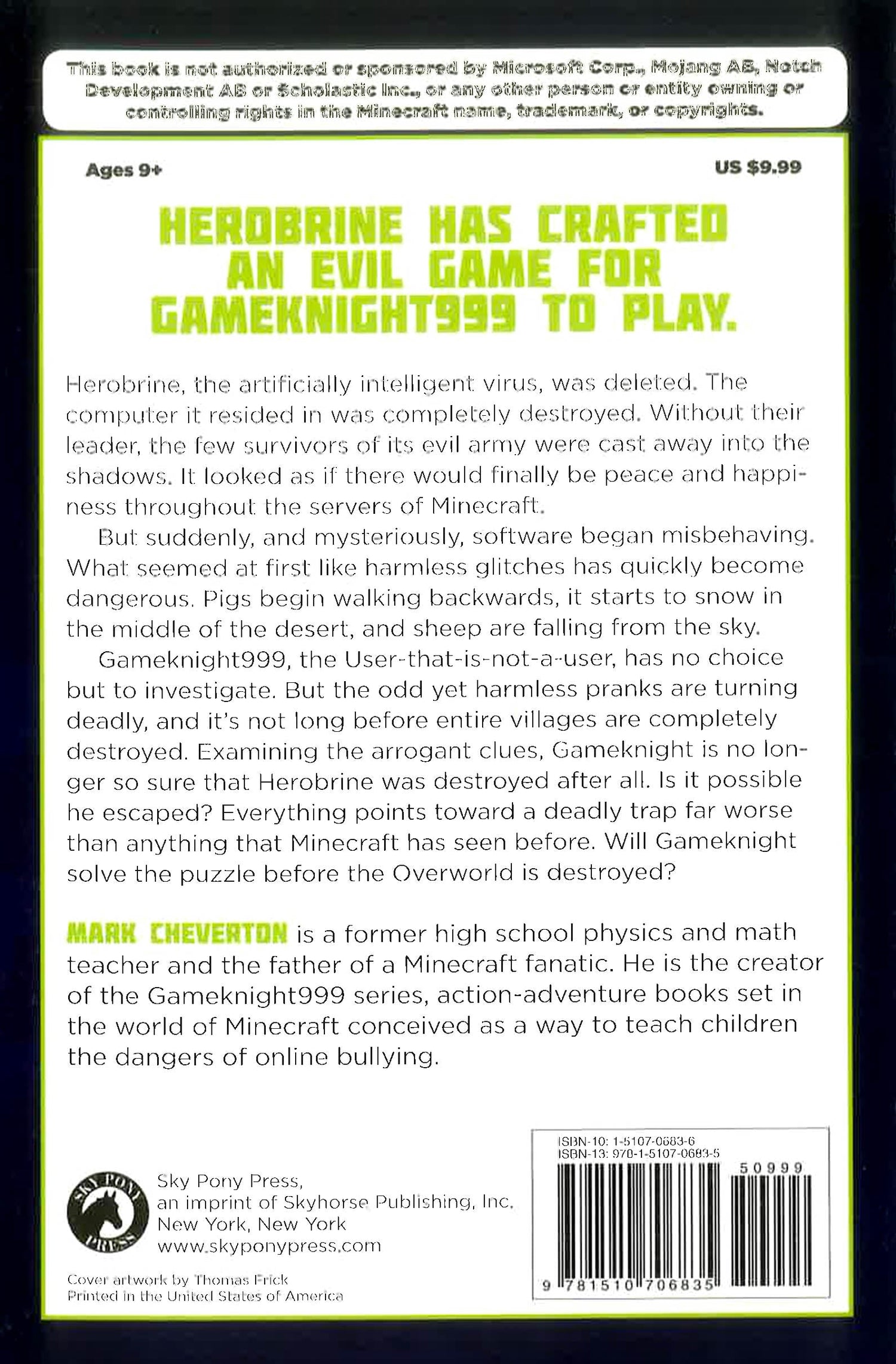 Herobrine has crafted an evil game for Gameknight999 to play.Herobrine, the artificially intelligent virus, was deleted. The computer it resided in was completely destroyed. Without their leader, the few survivors of its evil army were cast away into the shadows. It looked as if there would finally be peace and happiness throughout the servers of Minecraft.But suddenly, and mysteriously, software began misbehaving. Sheep fell from the sky. Snowballs appeared out of nowhere. What seemed at first like harmless glitches quickly became dangerous. Pigs begin walking backwards, it starts to snow in the middle of the desert, and sheep are falling from the sky.Gameknight999, the User-that-is-not-a-user, has no choice but to investigate. But the odd yet harmless pranks are turning deadly, and it’s not long before entire villages are completely destroyed. Examining the arrogant clues, Gameknight is no longer so sure that Herobrine was destroyed after all. Is it possible he escaped? Everything points towards a deadly trap far worse than anything that Minecraft has seen before. Will Gameknight solve the puzzle before the Overworld is destroyed?