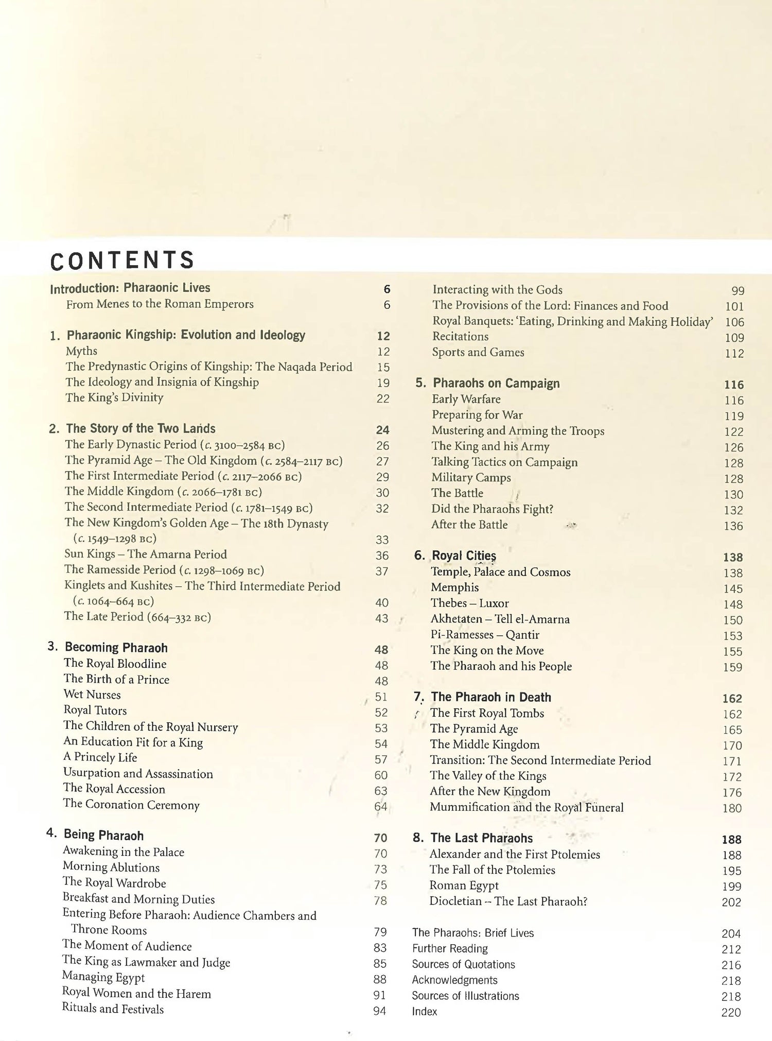 The first book to convey the full experience of what it was actually like to be pharaoh one of the most powerful rulers of the ancient world, Garry Shaw covers, through eight themed chapters, all aspects of the realities of pharaohs life, from mornings waking in the palace to evenings spent banqueting, with all his duties and activities in between. This vividly written and authoritative account provides new insights into key official ceremonies, including the accession and coronation, and the pomp and protocol of an audience before the king, and is supplemented by numerous box features, from the internal decoration of pyramids and the women who became pharaoh, to pharaonic pets, as well as quotations from contemporary sources and a complete king list with brief biographies of the major pharaohs. Beautifully illustrated with a wide range of images, most in colour, including temples and tombs, reliefs and wall paintings, jewelry and statues, line drawings and reconstructions, maps and plans, this book charts the development of a uniquely Egyptian vision of kingship, exemplified by the men and women who ascended the throne from mythical beginnings and the first ruler of a unified country, through renowned and supreme monarchs such as Khufu, Seti I and Ramesses II, to the decadence of the all-too human Ptolemies and pharaonic kingships last gasp under Roman rule.