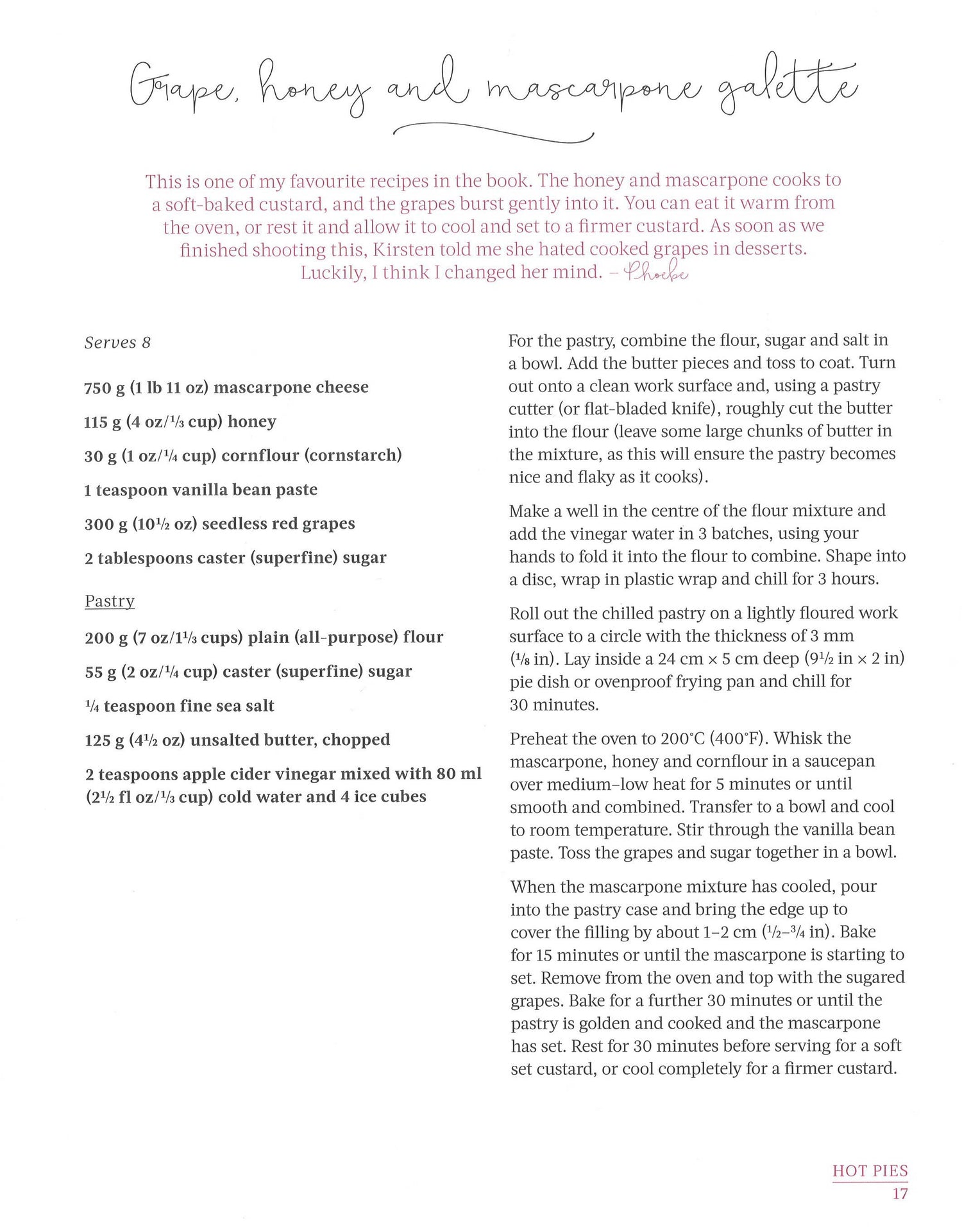 The Pie Project is a collection of 60 sweet pie recipes, in all their bubbling, fruity, caremelised, buttery glory. Pies are very forgiving desserts: spillages really are just an opportunity for more caremelisation and a mis-shapen pie just adds to the rustic feel. Readers are encouraged to use imperfect fruit, play around with lattice, design their own pastry top and bake the pies in whatever they have handy (some are cooked in skillets, or even enamel bowls). There are four chapters in this stunningly photographed book. The Hot Pies section features a Grape, Marscapone and Honey Skillet Pie; the Cheats' section features a Blueberry and Pear Cider Pie; the Hand Pies section features a Maple Syrup, Apple and Stem Ginger Pie; and the Cold Pies section features a Coconut Pie with Watermelon and Mint Sorbet. Delicious. All skill levels are catered for, as some pies are made with homemade pastry, others with bought. These methods sit alongside pies featuring biscuit bases, as well as bottomless pies. Phoebe and Kirsten are out to convince the world that pie really is a dish that should be enjoyed every day and The Pie Project is the collection to do it.