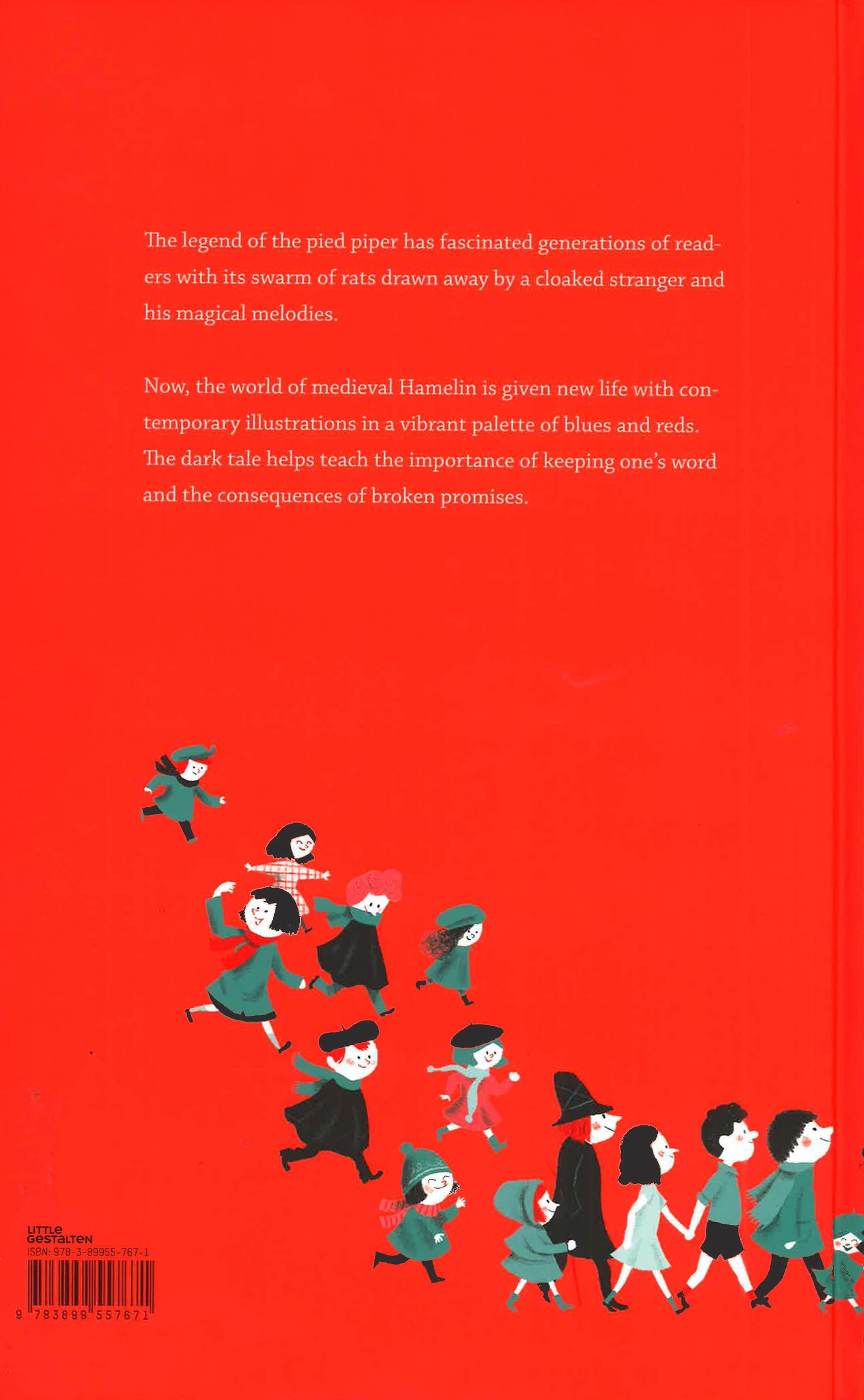 Through a bold palette, the legend of the Pied Piper is artfully enlivened. The Pied Piper of Hamelin is set in the north of Germany in the year 1283. It is nearly Christmas and the townspeople are ready to celebrate when a rodent infestation interrupts their everyday lives. The mayor announces a seemingly straightforward proposition: rid the town of the rats and be given one thousand gold coins. A stranger with a small pipe entices the rats beyond the town gates, but when he is unfairly denied his reward, the story takes an unexpected turn. Fictional or historical, the medieval legend of the Pied Piper has long fascinated generations of readers with its swarm of rats drawn away by a cloaked stranger and his magical melodies. Now, the beloved tale is given new life with Thomas Baas' contemporary illustrations in a vibrantly dark palette of blues and reds. The mysterious tale helps teach and reinforce the importance of keeping one's word and the consequences of broken promises.