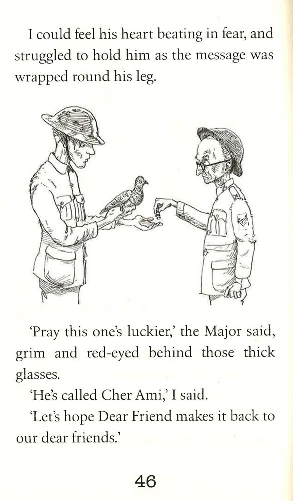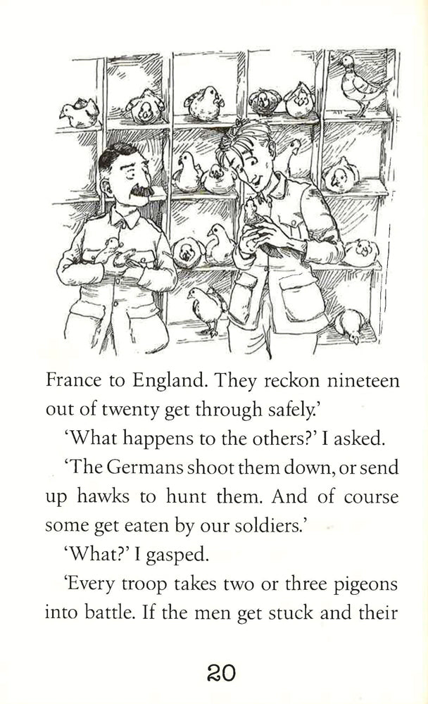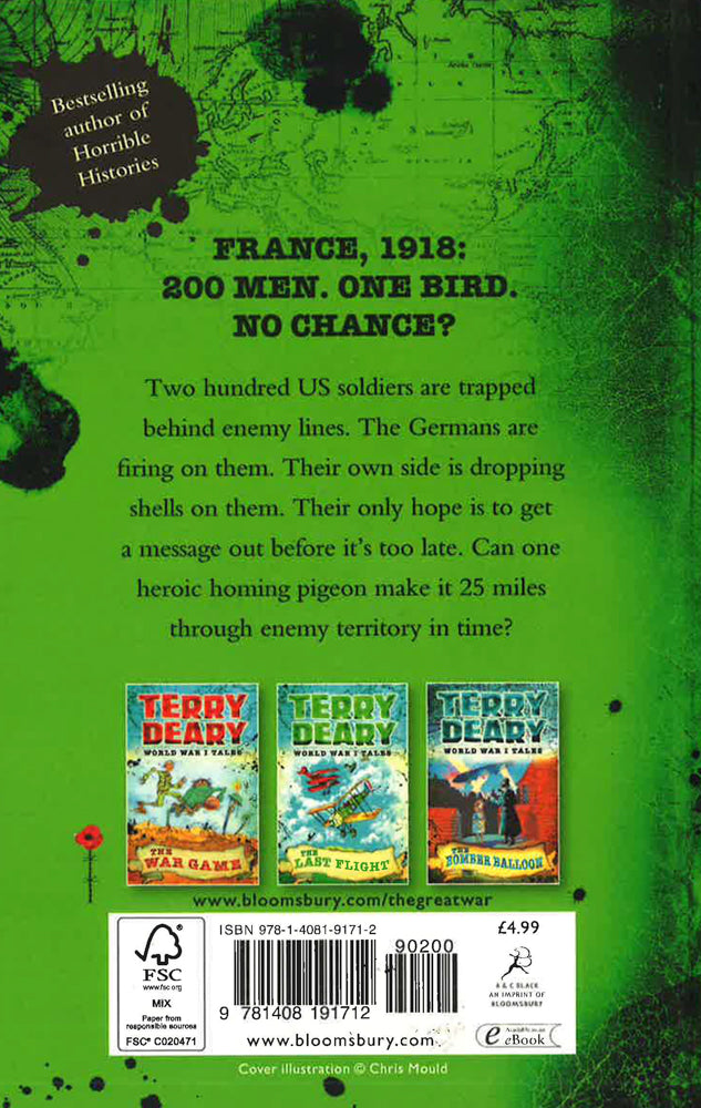 Stories of the First World War from the bestselling Terry Deary, author of the hugely successful Horrible Histories. Flanders 1918. The extraordinary true story of a pigeon who saved nearly 200 lives. A troop of Americans are trapped behind enemy lines. Not only are their German enemies firing at them but so are their own side. Somehow they have to get a message to their comrades. The only way is by pigeon. But every time a pigeon rises in the air it is shot down. The last pigeon, a black bird called Cher Ami, flies with bullets zipping through the air all around him, covering 25 miles in just 65 minutes, helping to save the lives of the 194 survivors. In his epic journey he is shot through the breast, blinded in one eye, and left with a leg hanging only by a tendon. Army medics save his life. They can't save his leg, so they carve a small wooden one for him. When he recovers, the pigeon is put on a boat to the United States, a hero. Astonishing true tale of animals at war from master historical storyteller Terry Deary, for 7+.