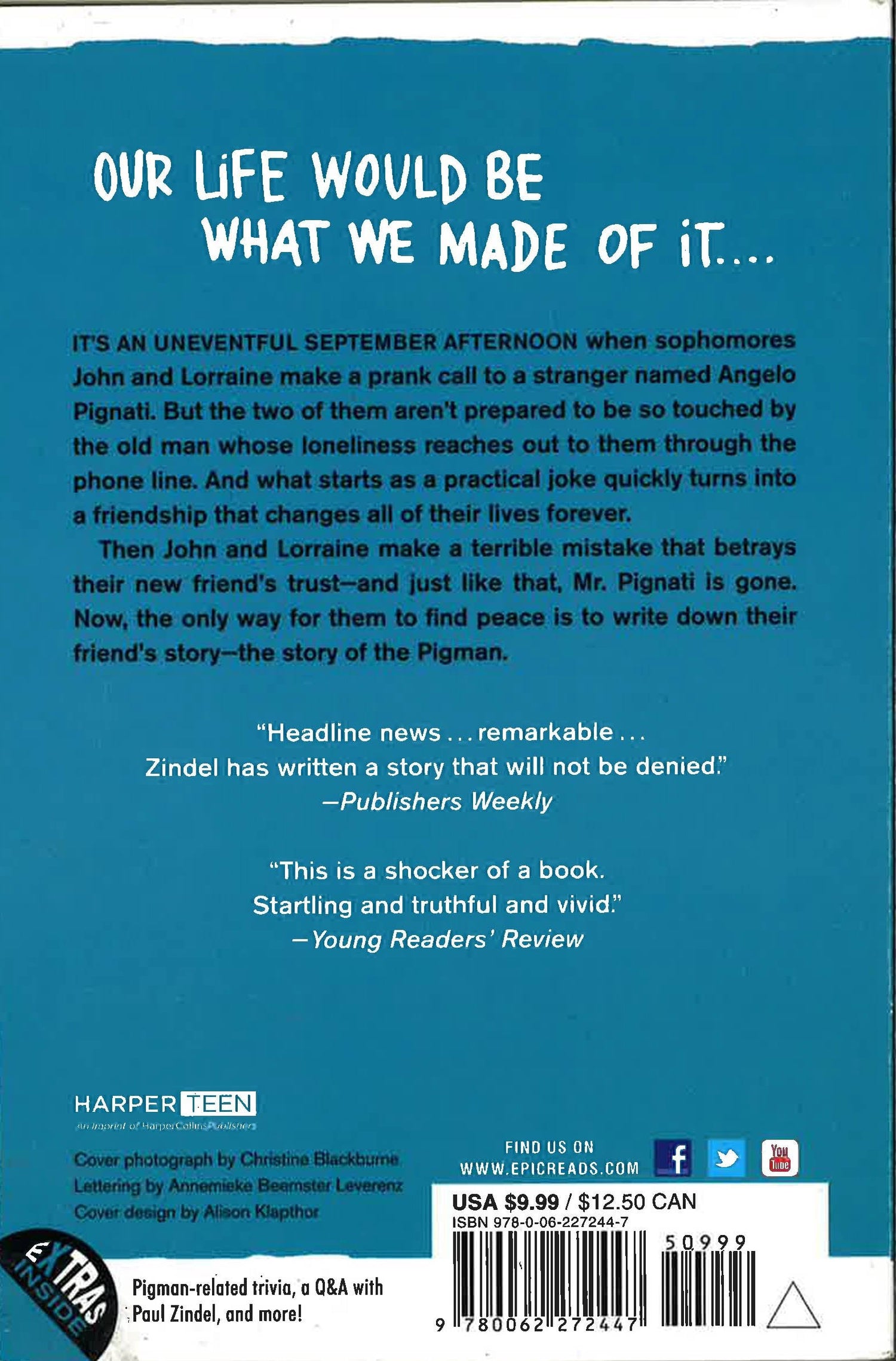 Our life would be what we made of it. . . . It's an uneventful September afternoon when sophomores John and Lorraine make a prank call to a stranger named Angelo Pignati. But the two of them aren't prepared to be so touched by the old man whose loneliness reaches out to them through the phone line. And what starts as a practical joke quickly turns into a friendship that changes all of their lives forever. Then John and Lorraine make a terrible mistake that betrays their new friend's trust--and just like that, Mr. Pignati is gone. Now, the only way for them to find peace is to write down their friend's story--the story of the Pigman.