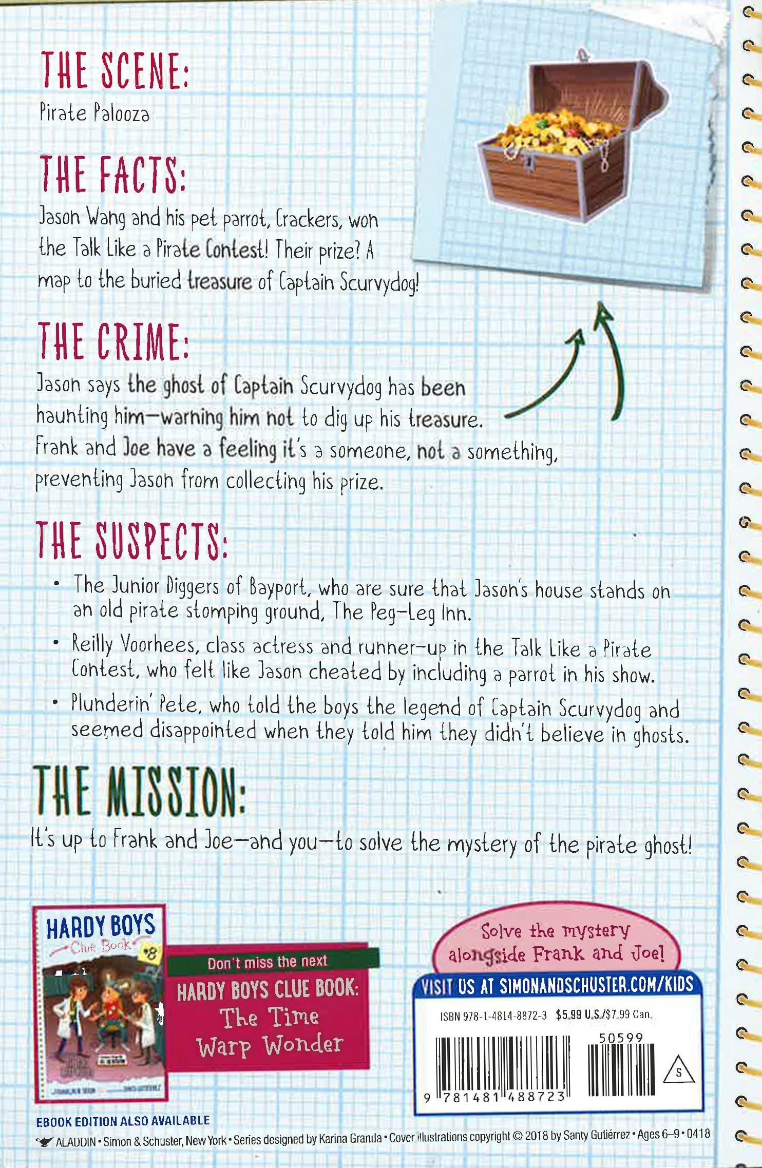 Detective brothers Frank and Joe work to uncover a pirate ghost hoax in the seventh book in the interactive Hardy Boys Clue Book series.The Hardy Boys are super excited when their friend Jason Wang wins the “Talk Like a Pirate Contest” at Bayport’s annual Pirate Palooza. Jason’s prize is a map to the legendary pirate, Captain Scurvydog’s buried treasure. Expert detectives Frank and Joe offer to help him find it.But the next day, Jason tells the brothers that he won’t be doing any treasure hunting. He says the ghost of Captain Scurvydog has been haunting him; his parrot is singing pirate songs he’s never been taught, pirate coins appeared on his windowsill, and there’s a mysterious note in a bottle warning Jason to stay away from buried treasure. To Jason, the message is clear: stay away from Captain Scurvydog’s booty! Frank and Joe don’t believe in ghosts. They’re sure someone is tricking Jason so they can dig up the buried treasure themselves. The only question is, who?
