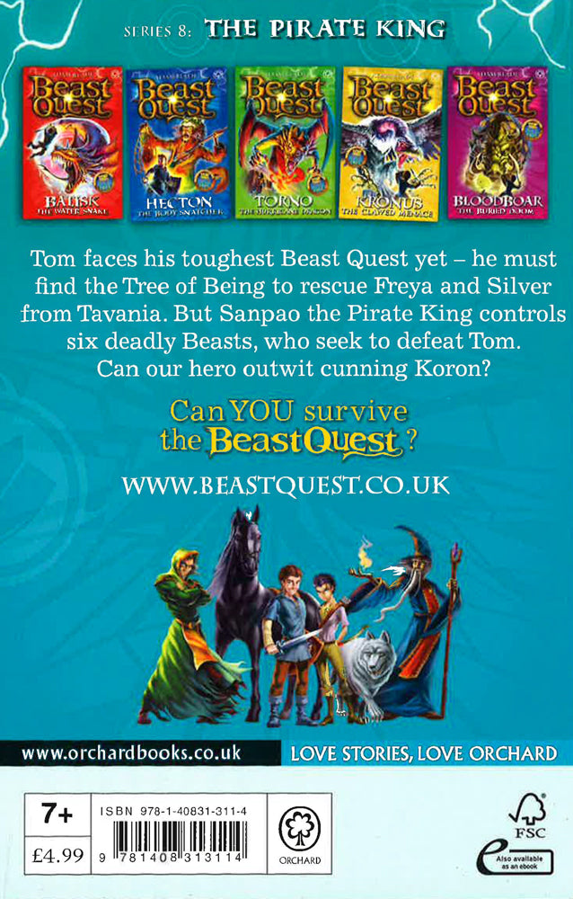 Battle fearsome beasts and fight evil with Tom and Elenna in the bestselling adventure series for boys and girls aged 7 and up.Battle fearsome beasts and fight evil with Tom and Elenna in the bestselling adventure series for boys and girls aged 7 and up.Tom faces his toughest Beast Quest yet - he must find the Tree of Being to rescue Freya and Silver from Tavania. But Sanpao the Pirate King controls six deadly Beasts, which seek to thwart Tom. Can our hero outwit cunning Koron?There are SIX thrilling adventures to collect in the Beast Quest: The Pirate King series: Balisk the Water Snake; Koron the Jaws of Death; Hecton the Body Snatcher; Tomo the Hurricane Dragon; Kronus the Clawed Menace; Bloodboar the Buried Doom.If you like Beast Quest, check out Adam Blade's other series: Team Hero, Sea Quest and Beast Quest: New Blood!