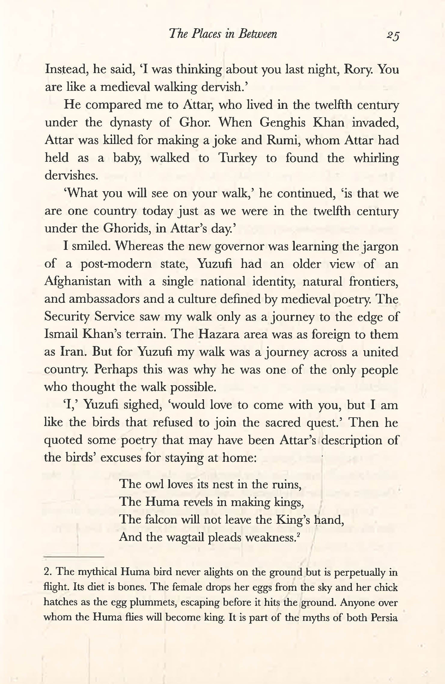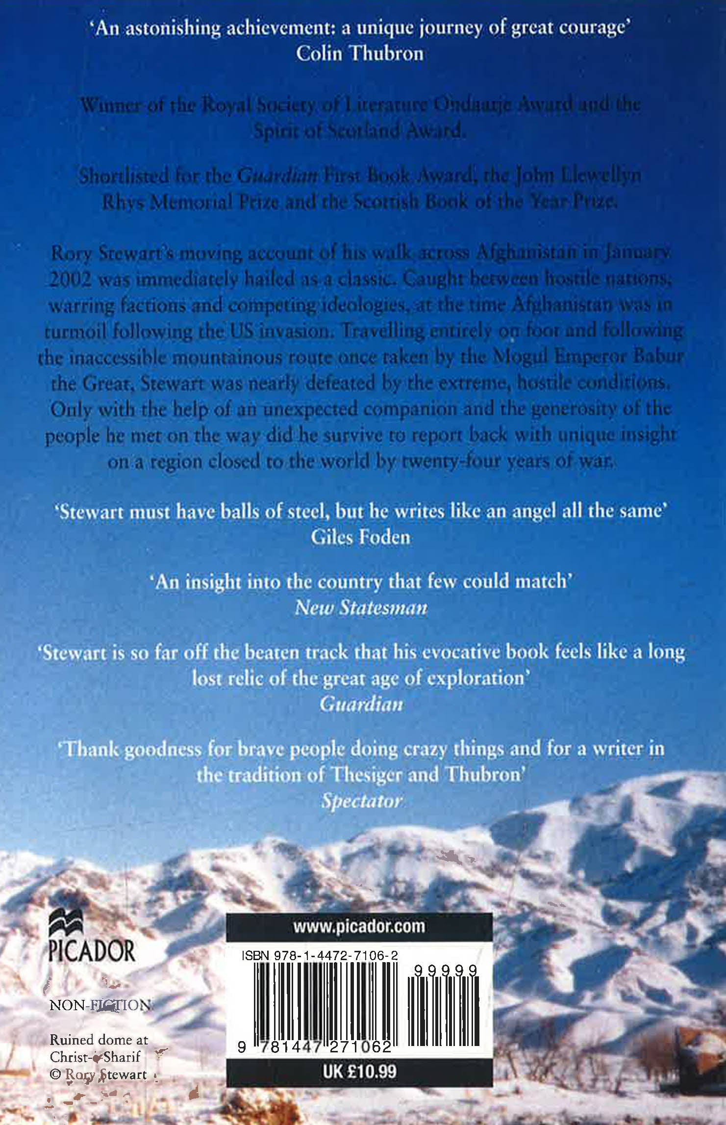 In January 2002, Rory Stewart walked across Afghanistan, surviving by his wits, the kindness of strangers, and his knowledge of Persian dialects and Muslim customs. By day he passed through mountains covered in nine feet of snow, hamlets burned and emptied by the Taliban, and communities thriving amid the remains of medieval civilizations. By night he slept on villagers' floors, shared their meals, and listened to their stories of the recent and ancient past.