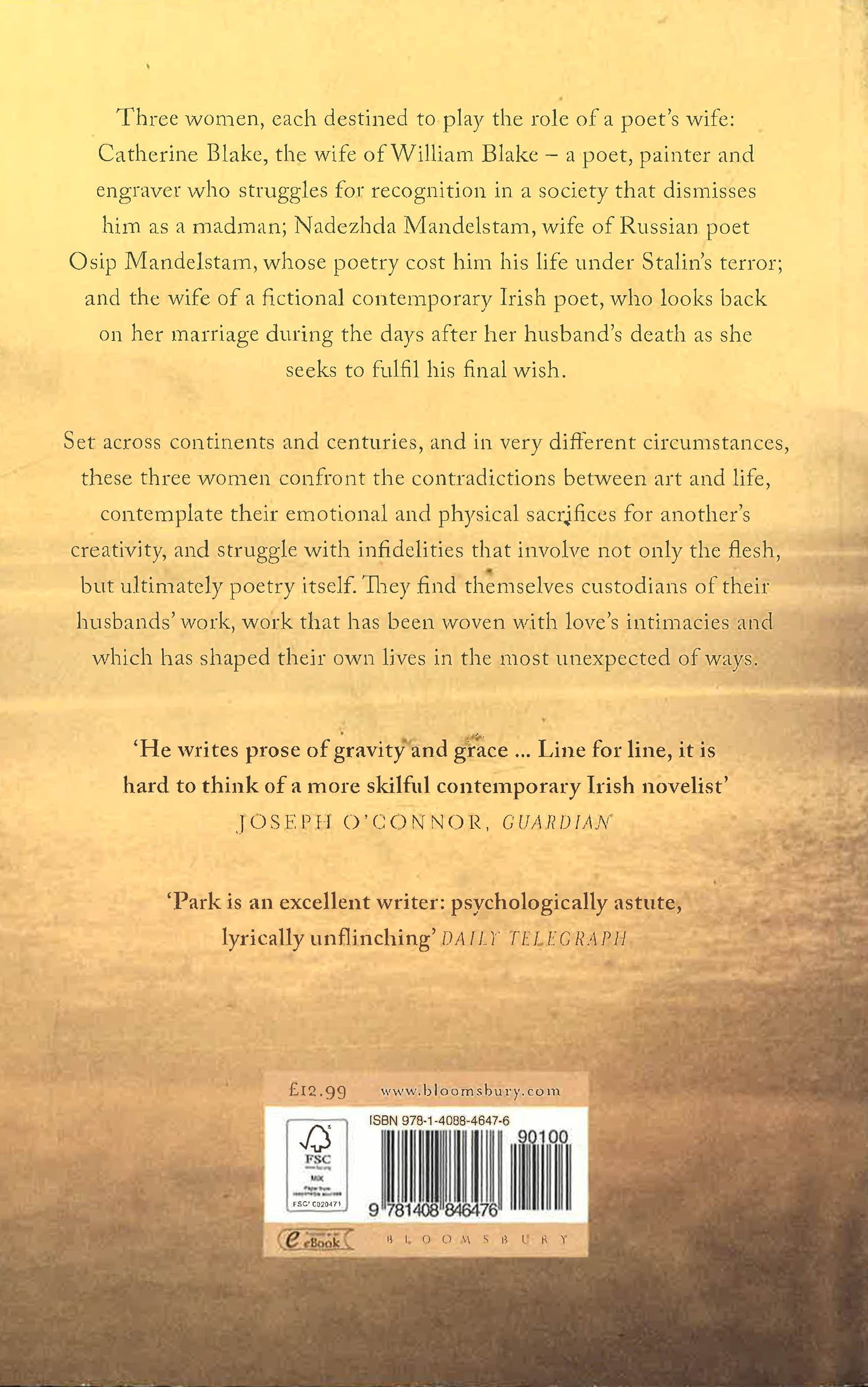 Three women, each destined to play the role of a poet's wife: Catherine Blake, the wife of William Blake - a poet, painter and engraver who struggles for recognition in a society that dismisses him as a madman; Nadezhda Mandelstam, wife of Russian poet Osip Mandelstam, whose poetry costs him his life under Stalin's terror; and the wife of a fictional contemporary Irish poet, who looks back on her marriage during the days after her husband's death as she seeks to fulfil his final wish. Set across continents and centuries, and in very different circumstances, these three women confront the contradictions between art and life, contemplate their emotional and physical sacrifices for another's creativity, and struggle with infidelities that involve not only the flesh, but ultimately poetry itself. They find themselves custodians of their husbands' work, work that has been woven with love's intimacies and which has shaped their own lives in the most unexpected of ways.