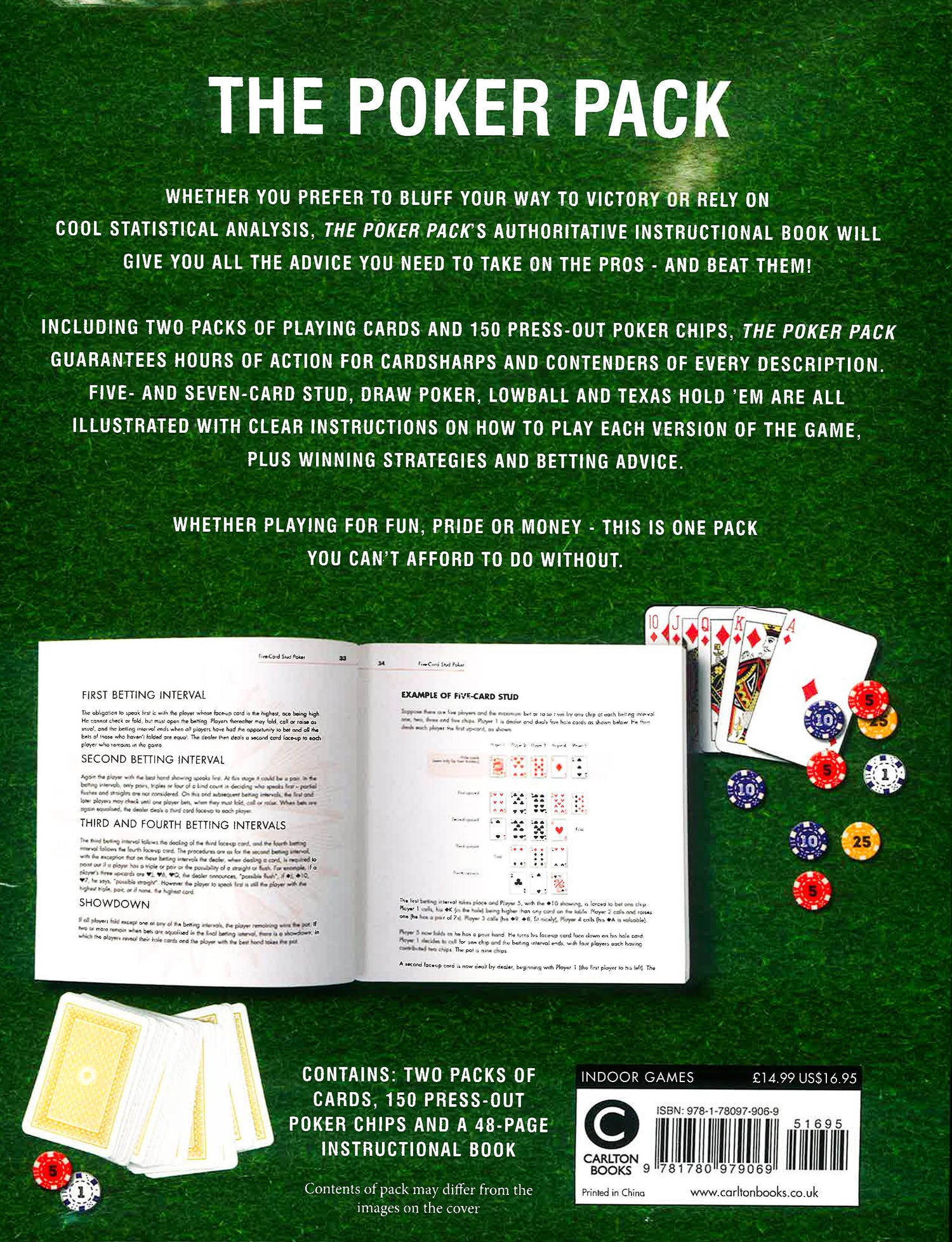 Whether you prefer to bluff your way to victory or rely on cool statistical analysis, The Poker Pack's authoritative instructional book will give you all the advice you need to take on the pros - and beat them!Including two packs of playing cards and 150 press-out poker chips, The Poker Pack guarantees hours of action for cardsharps and contenders of every description. Five- and Seven-Card Stud, Draw Poker, Lowball and Texas Hold'Em are all illustrated with clear instructions on how to play each version of the game, plus winning strategies and betting advice.