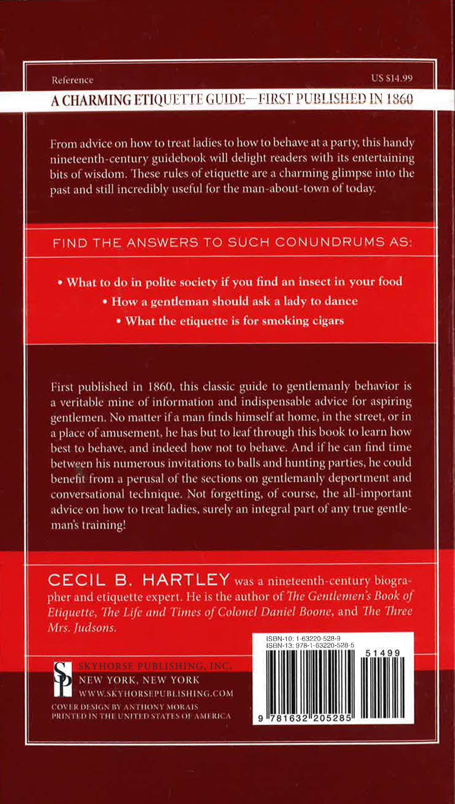 Ever wondered what to do in polite society if you find an insect in your food? Or how a gentleman should ask a lady to dance? And what on earth is the etiquette for smoking cigars? First published in 1860, this classic guide to gentlemanly behavior is a veritable mine of information and indispensable advice for aspiring gentlemen. No matter if a man finds himself at home, in the street, or in a place of amusement, he has but to leaf through this book to learn how best to behave, and indeed how not to behave. And if he can find time between his numerous invitations to balls and hunting parties, he could benefit from a perusal of the sections on gentlemanly deportment and conversational technique. Not forgetting, of course, the all-important advice on how to treat ladies, surely an integral part of any true gentleman's training.