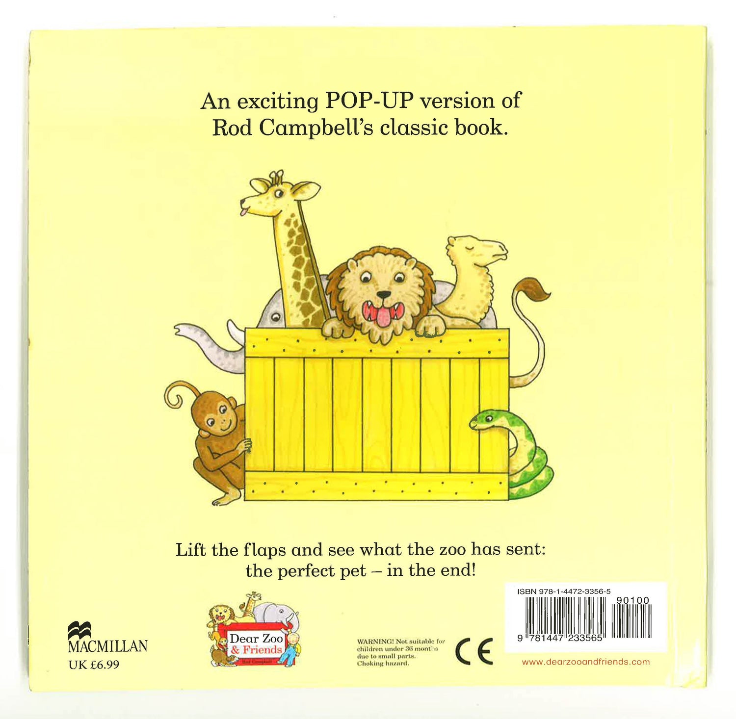 I wrote to the zoo to send me a pet . . .'Rod Campbell's classic lift-the-flap book Dear Zoo has been a firm favourite with toddlers and parents alike ever since it was first published in 1982. This pop-up edition of the story is packed full of exciting surprises and retains all the charm of the original.Lift the flaps on every page of The Pop-Up Dear Zoo to discover what the zoo has sent and see all your favourite animals spring to life! You can find a very tall giraffe, a fierce lion with real bite and a very jumpy frog, but will the zoo send the perfect pet in the end?With bright, bold artwork, a catchy refrain and a pop-up surprise on every page, The Pop-Up Dear Zoo is a must for every child's bookshelf.