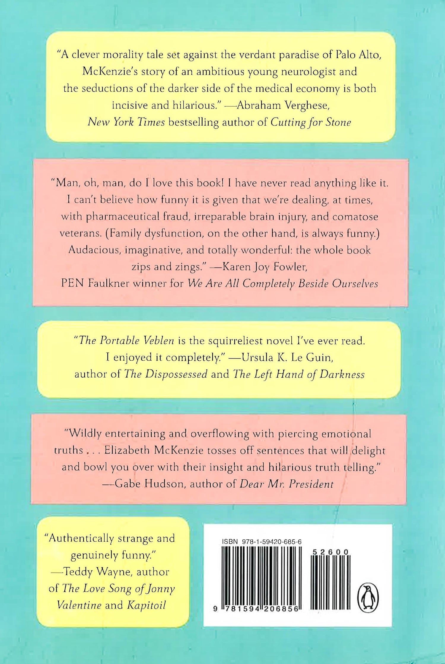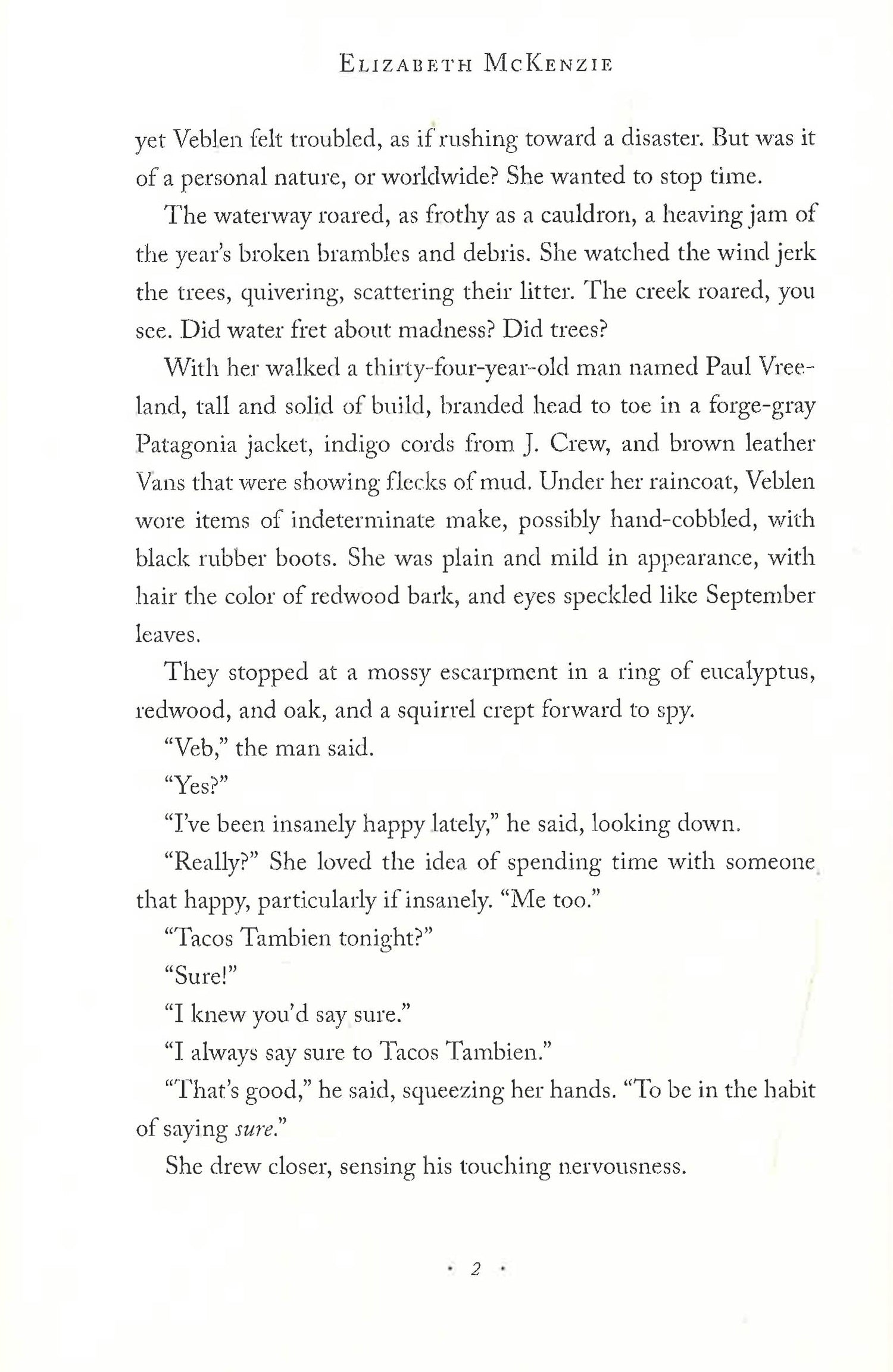 An exuberant, one-of-a-kind novel about love and family, war and nature, new money and old values by a brilliant New Yorker contributor The Portable Veblen is a dazzlingly original novel that's as big-hearted as it is laugh-out-loud funny. Set in and around Palo Alto, amid the culture clash of new money and old (antiestablishment) values, and with the specter of our current wars looming across its pages, The Portable Veblen is an unforgettable look at the way we live now. A young couple on the brink of marriage--the charming Veblen and her fiancé Paul, a brilliant neurologist--find their engagement in danger of collapse. Along the way they weather everything from each other's dysfunctional families, to the attentions of a seductive pharmaceutical heiress, to an intimate tète-à-tète with a very charismatic squirrel. Veblen (named after the iconoclastic economist Thorstein Veblen, who coined the term "conspicuous consumption") is one of the most refreshing heroines in recent fiction. Not quite liberated from the burdens of her hypochondriac, narcissistic mother and her institutionalized father, Veblen is an amateur translator and "freelance self"; in other words, she's adrift. Meanwhile, Paul--the product of good hippies who were bad parents--finds his ambition soaring. His medical research has led to the development of a device to help minimize battlefield brain trauma--an invention that gets him swept up in a high-stakes deal with the Department of Defense, a Bizarro World that McKenzie satirizes with granular specificity. As Paul is swept up by the promise of fame and fortune, Veblen heroically keeps the peace between all the damaged parties involved in their upcoming wedding, until she finds herself falling for someone--or something--else. Throughout, Elizabeth McKenzie asks: Where do our families end and we begin? How do we stay true to our ideals? And what is that squirrel really thinking? Replete with deadpan photos and sly appendices, The Portable Veblen is at once an honest inquiry into what we look for in love and an electrifying reading experience.