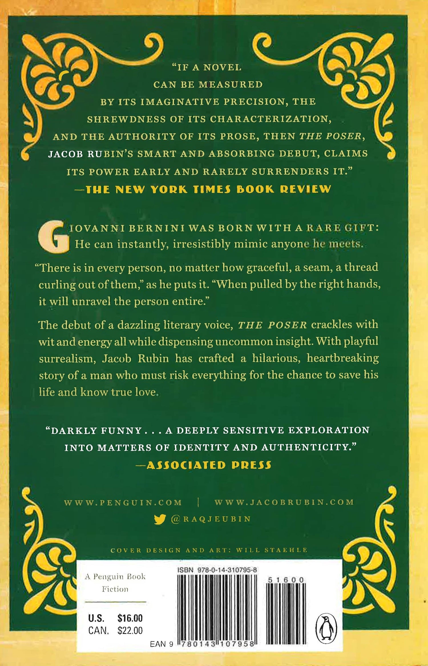 All his life, Giovanni Bernini has possessed an uncanny gift: he can imitate anyone he meets. Honed by his mother at a young age, the talent catapults him from small-town obscurity to stardom. As Giovanni describes it, "No one's disguise is perfect. There is in every person, no matter how graceful, a seam, a thread curling out of them. . . . When pulled by the right hands, it will unravel the person entire." As his fame grows, Giovanni encounters a beautiful and enigmatic stage singer, Lucy Starlight--the only person whose thread he cannot find--and becomes increasingly trapped inside his many poses. Ultimately, he must assume the one identity he has never been able to master: his own. In the vein of Jonathan Lethem's and Kevin Wilson's playful surrealism, Jacob Rubin's The Poser is the debut of a major literary voice, a masterfully written, deeply original comic novel, and the moving story of a man who must risk everything for the chance to save his life and know true love.