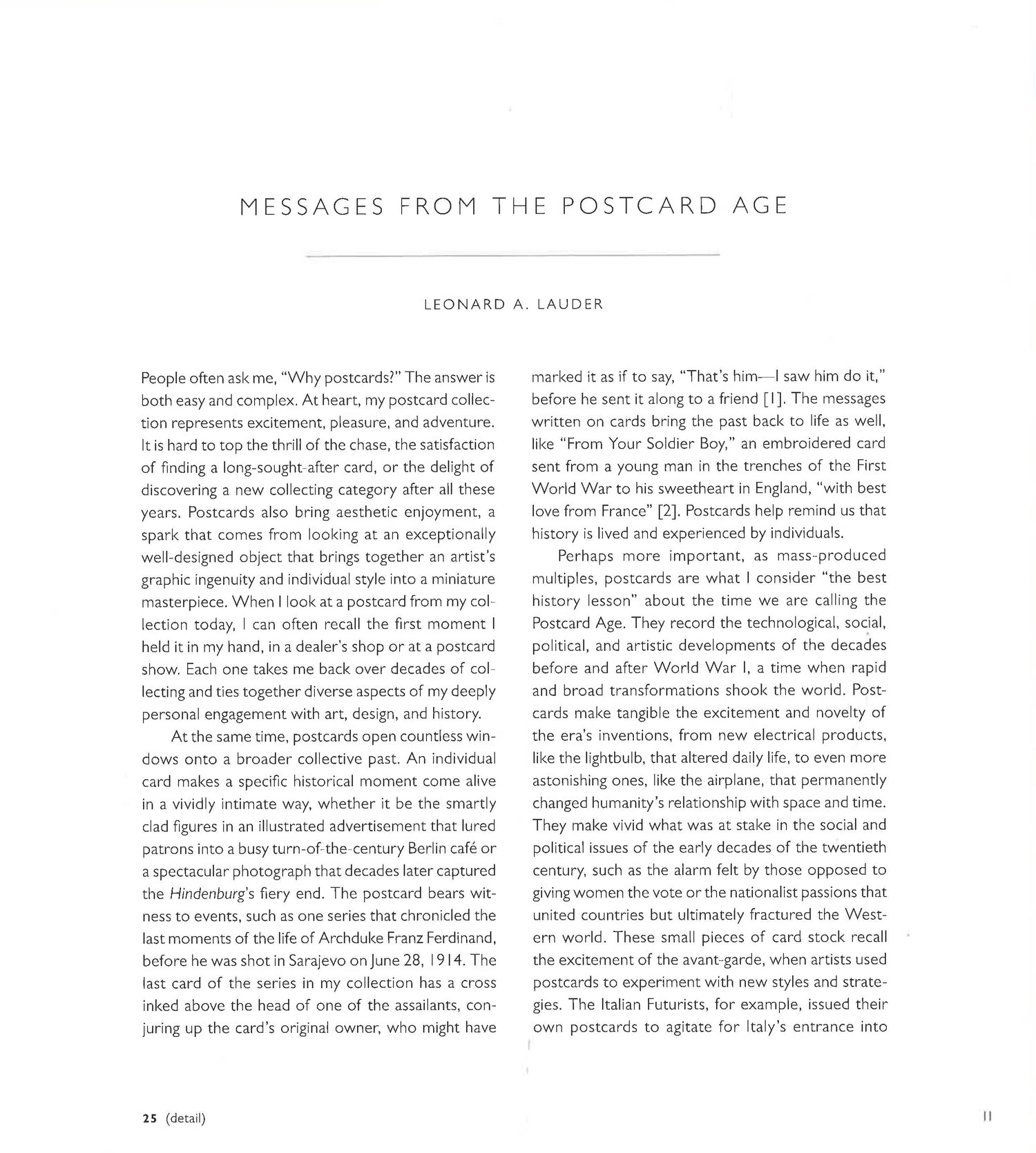In the decades around 1900, postcards were Twitter, email, Flickr and Facebook, all wrapped into one. A postcard craze swept the world, and billions of cards were bought, mailed and pasted into albums. Many famous artists turned to the new medium, but one of the great pleasures and enigmas of postcards is how some of the most beautiful and interesting examples were made by artists whose names we barely know. Drawing on the riches of the Leonard A. Lauder Postcard Collection (probably the finest and most comprehensive collection of its type), this gorgeous book traces the historical and cultural themes--enthralling, exciting, and sometimes disturbing--of the modern age. The first general publication on the postcard as an artistic medium since the mid-1970s, "The Postcard Age" is organized thematically, with chapters devoted to urban life, the changing role of women, sports, celebrity, new technologies, the stylish collectors' cards of Art Nouveau and World War I. The result is at once a vivid picture of the concerns and pastimes of the turn of the century and a sampler from the Lauder's vast archives.