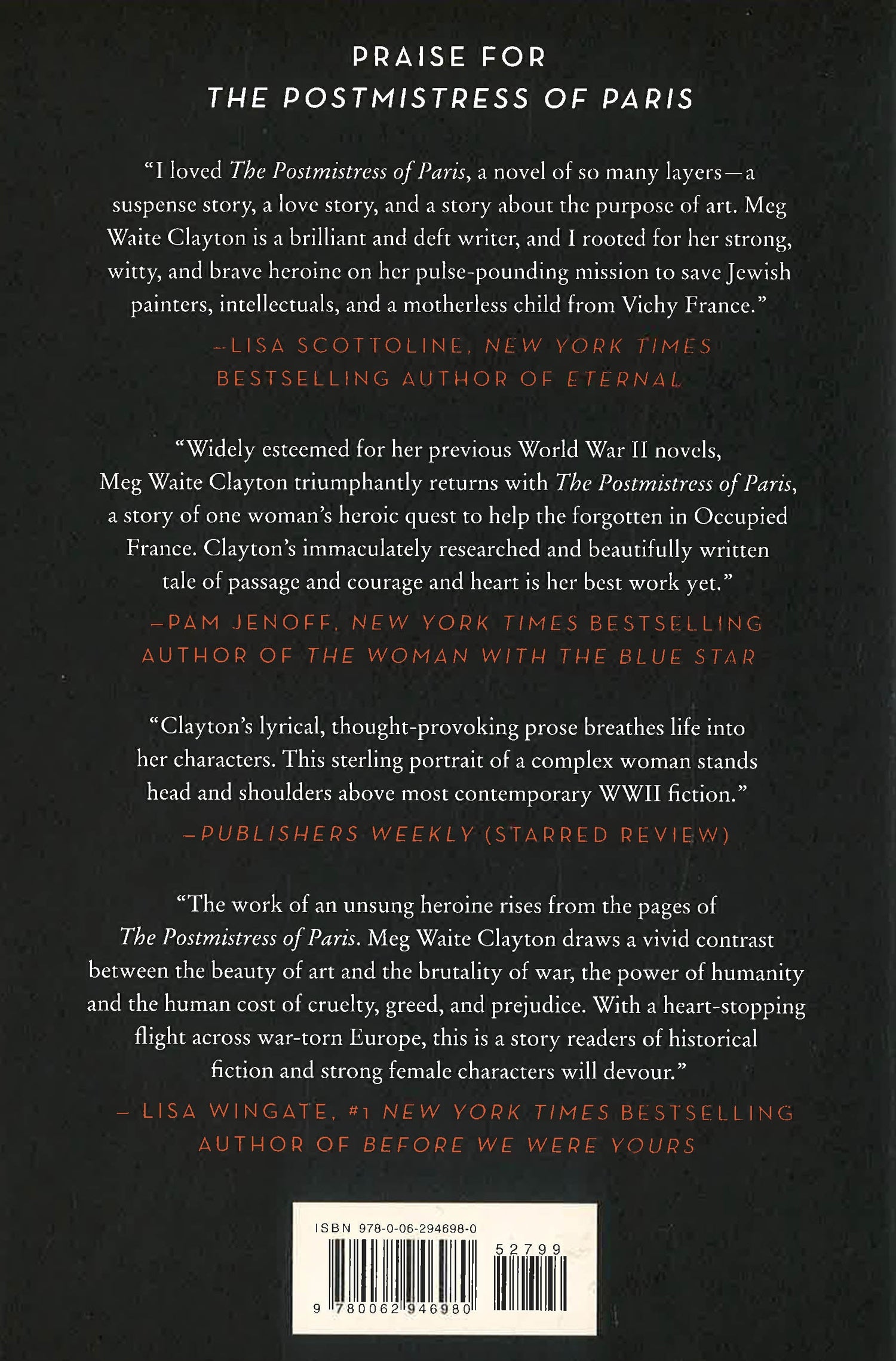 Inspired by the real life Chicago heiress Mary Jayne Gold, who worked with American journalist Varian Fry to smuggle artists and intellectuals out of France, The Postmistress of Paris is the haunting story of an indomitable woman whose strength, bravery, and love is a beacon of hope in a time of terror.