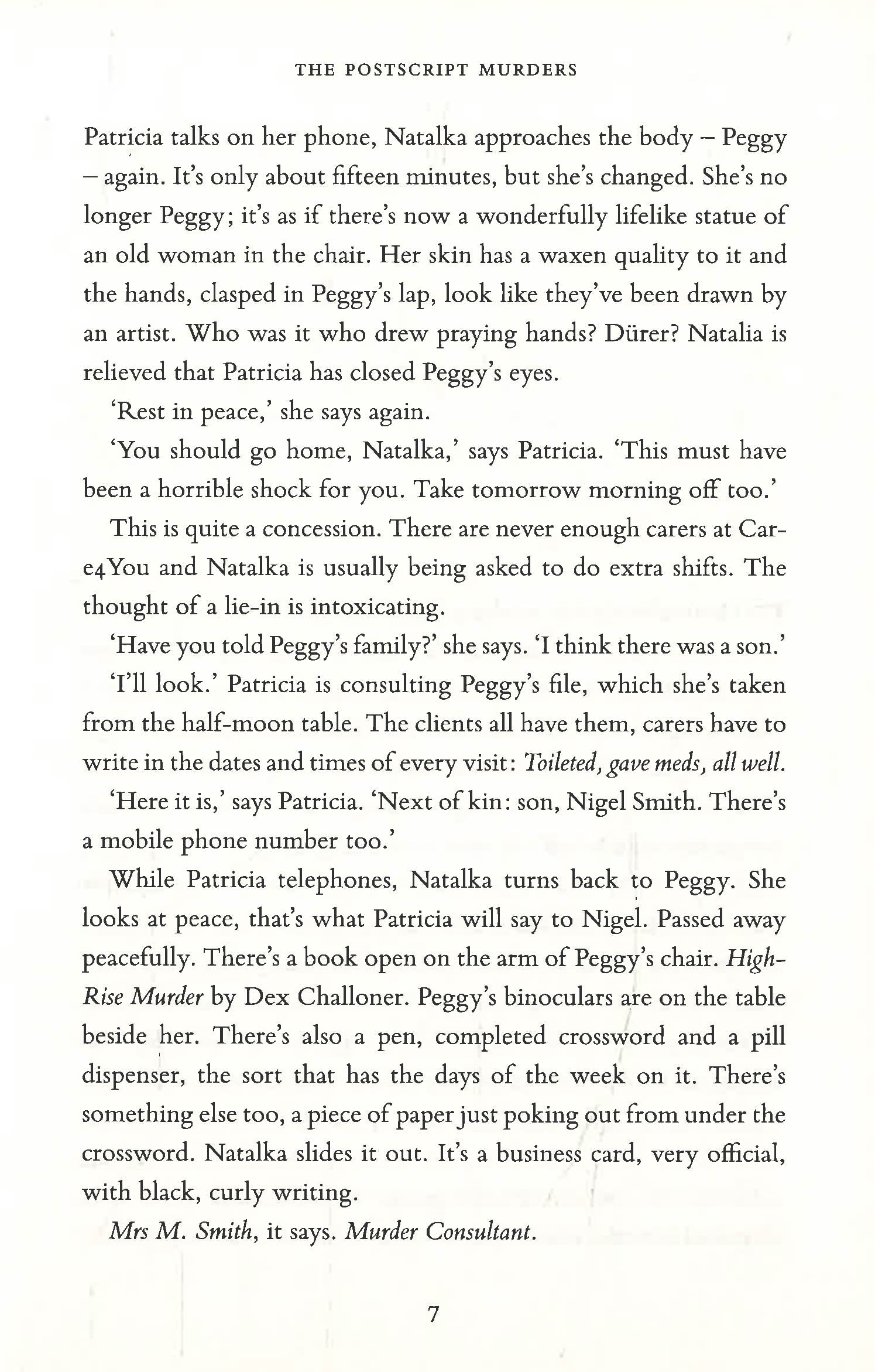 But Natalka had a reason to be at the police station: while clearing out Peggy’s flat, she noticed an unusual number of crime novels, all dedicated to Peggy. And each psychological thriller included a mysterious postscript: PS: for PS. When a gunman breaks into the flat to steal a book and its author is found dead shortly thereafter—Detective Kaur begins to think that perhaps there is no such thing as an unsuspicious death after all.