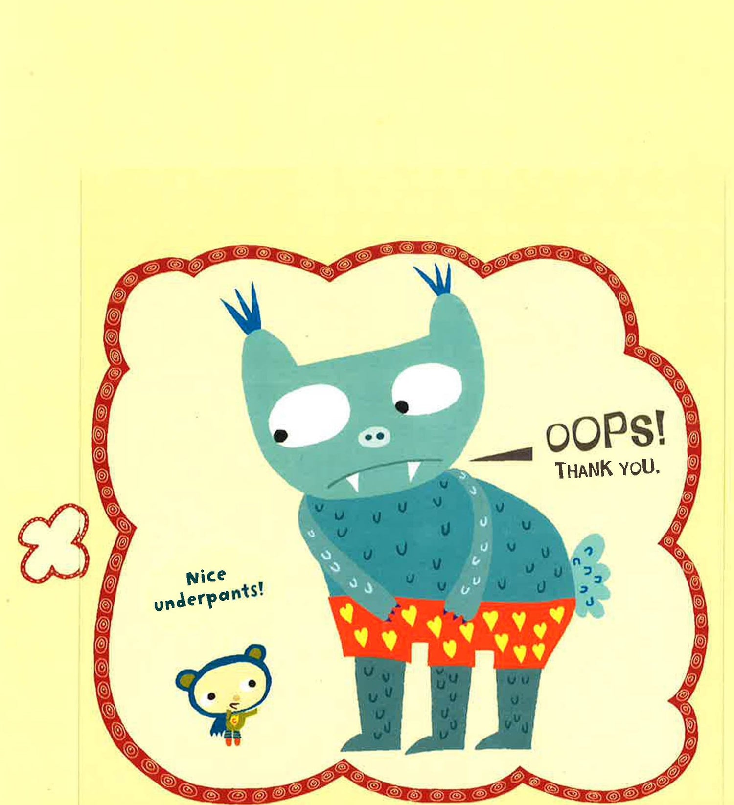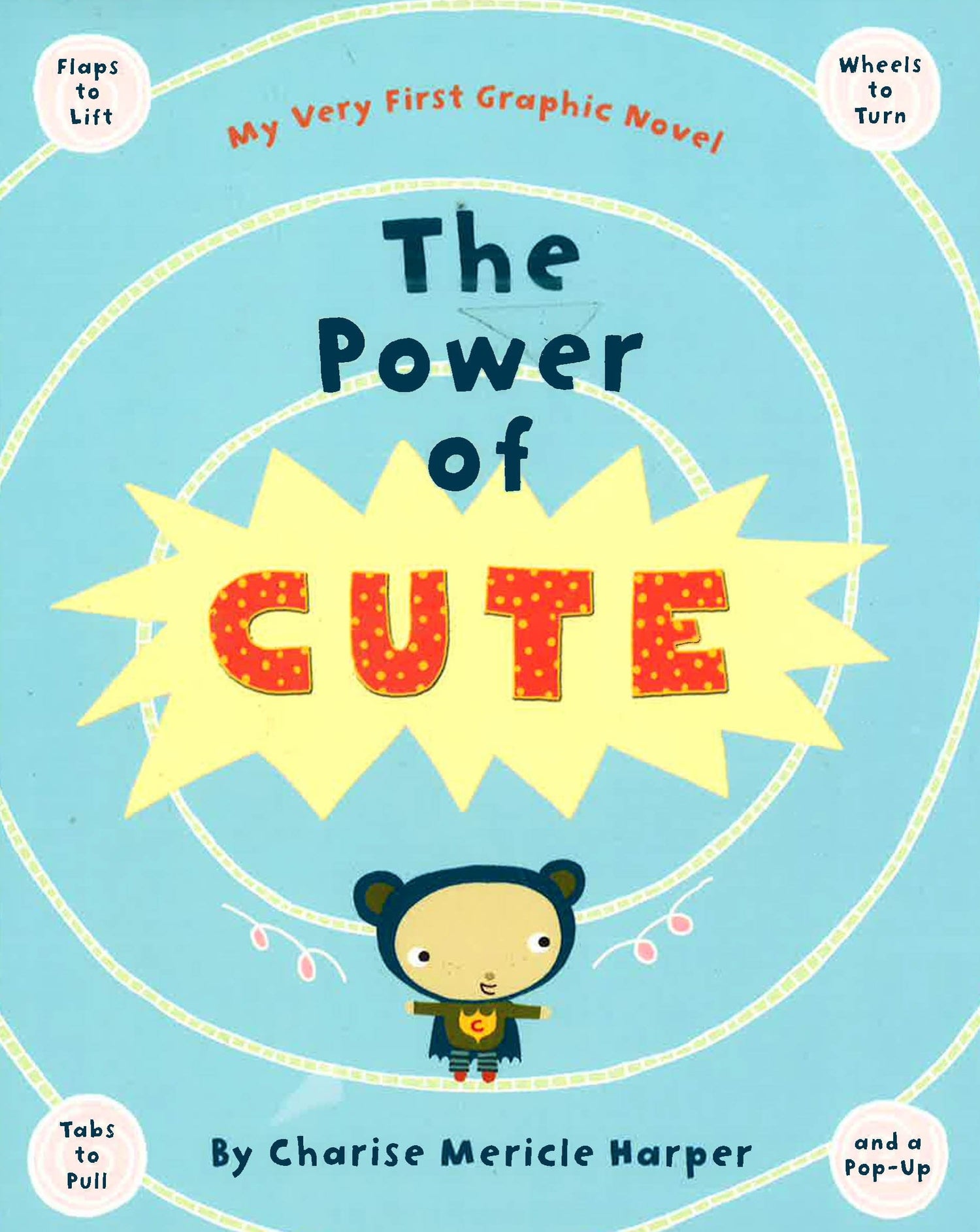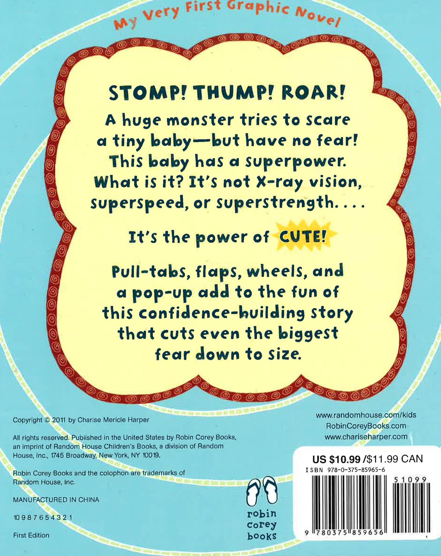 The Power of Cute features lift-the-flaps, pull-tabs, and simple pop-ups and is told in a young graphic novel style. A hilariously dressed monster confronts a superhero baby and is very miffed that he is not scaring the baby. And why isn't the baby scared? Because the baby has a superpower--the power of cute--and, through this superpower, transforms the scary monster into a cute baby monster.