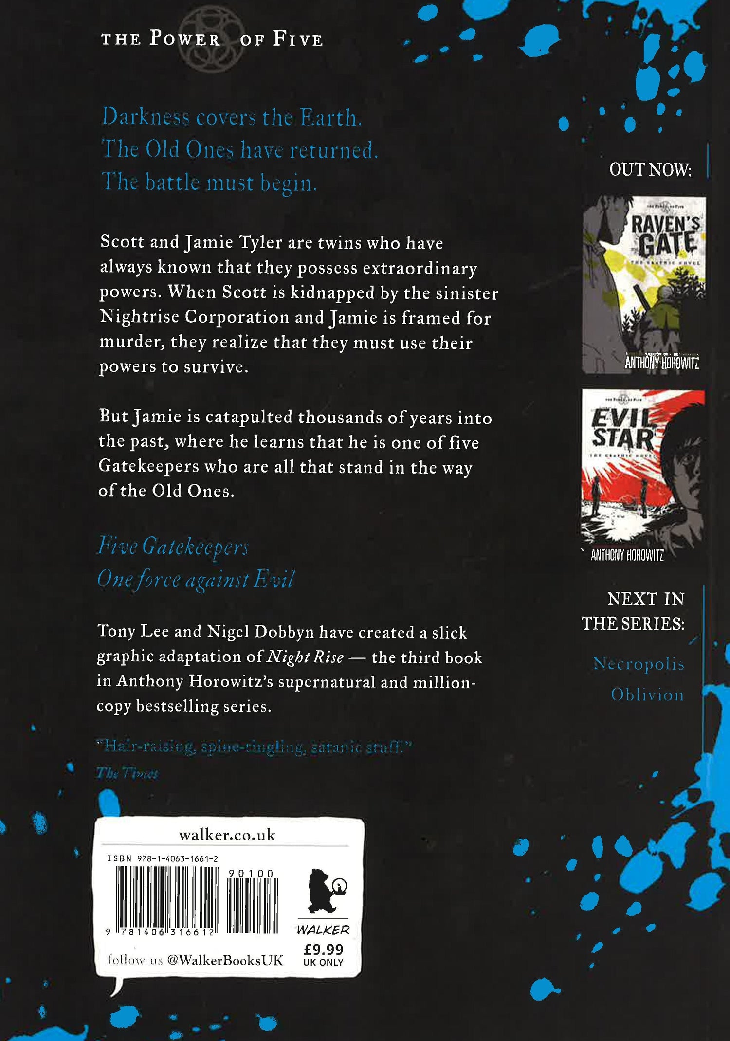 A compelling and slick graphic adaptation of Night Rise - the third book in this epic, supernatural and action-packed series by bestselling author Anthony Horowitz. Fourteen-year-old twins Scott and Jamie Tyler have never known who they are or where they came from, but they have always known that they possess extraordinary powers. When Scott is kidnapped by the sinister Nightrise Corporation and Jamie is framed for a murder, they realize that they must use those powers if they are going to survive. But Jamie is catapulted thousands of years into the past, bringing him face to face with the full horror of the Old Ones. Here Jamie learns that he is one of the five Gatekeepers whose power is all that stands in the way of eternal chaos. Together at last, the Five must fight the massed forces of evil. And they must win.