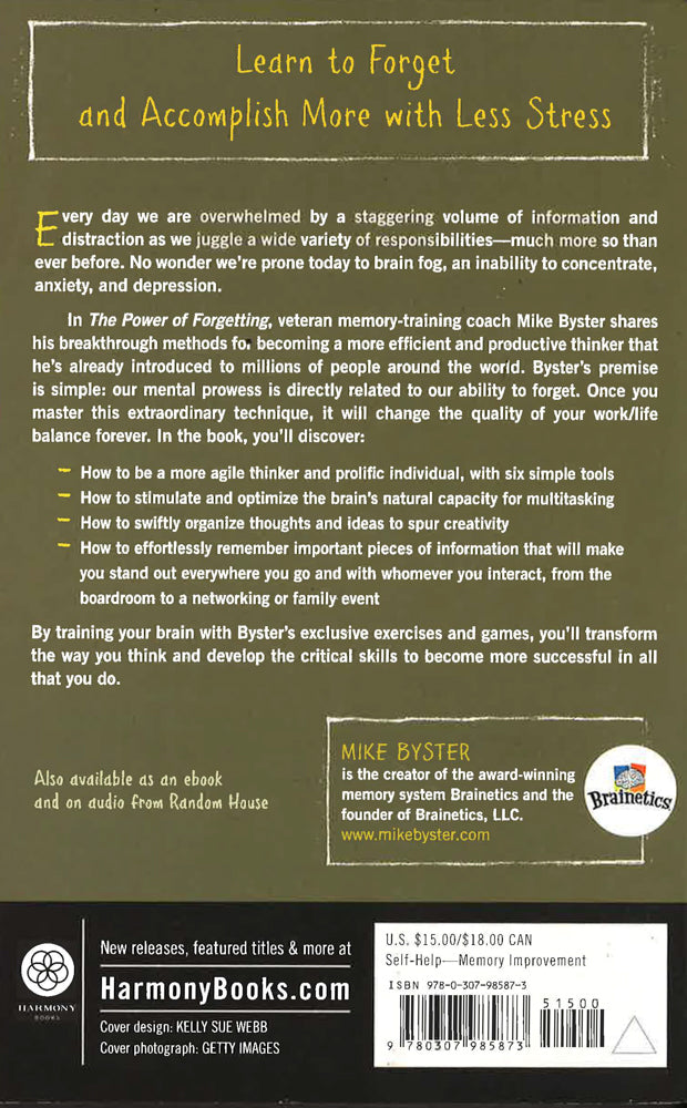 An uncommon guide for accomplishing more every day by engaging the unique skill of forgetting, from the creator of the award-winning memory training system Brainetics Is it possible that the answer to becoming a more efficient and effective thinker is learning how to forget? Yes! Mike Byster will show you how mastering this extraordinary technique--forgetting unnecessary information, sifting through brain clutter, and focusing on only important nuggets of data--will change the quality of your work and life balance forever. Using the six tools in The Power of Forgetting, you'll learn how to be a more agile thinker and productive individual. You will overcome the staggering volume of daily distractions that lead to to brain fog, an inability to concentrate, lack of creativity, stress, anxiety, nervousness, angst, worry, dread, and even depression. By training your brain with Byster's exclusive quizzes and games, you'll develop the critical skills to become more successful in all that you do, each and every day.
