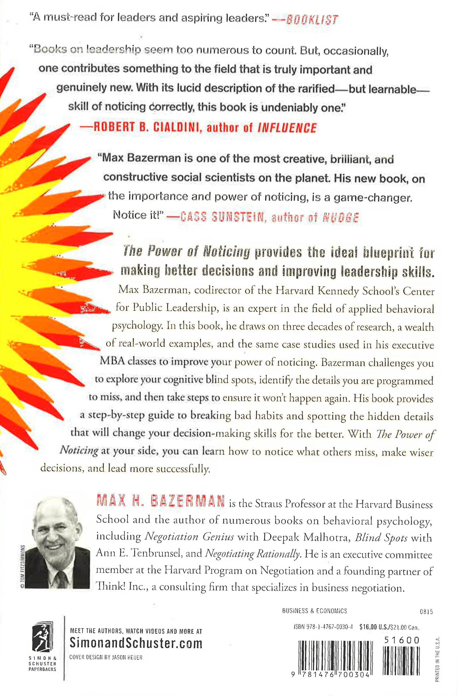 Imagine your advantage in negotiations, decision-making, and leadership if you could teach yourself to see and evaluate information that others overlook. The Power of Noticing provides the blueprint for accomplishing precisely that. Max Bazerman, an expert in the field of applied behavioral psychology, draws on three decades of research and his experience instructing Harvard Business School MBAs and corporate executives to teach you how to notice and act on information that may not be immediately obvious. Drawing on a wealth of real-world examples and using many of the same case studies and thought experiments designed in his executive MBA classes, Bazerman challenges you to explore your cognitive blind spots, identify any salient details you are programmed to miss, and then take steps to ensure it won't happen again. His book provides a step-by-step guide to breaking bad habits and spotting the hidden details that will change your decision-making and leadership skills for the better, teaching you to pay attention to what didn't happen, acknowledge self-interest, invent the third choice, and realize that what you see is not all there is. While many bestselling business books have explained how susceptible to manipulation our irrational cognitive blind spots make us, Bazerman helps you avoid the habits that lead to poor decisions and ineffective leadership in the first place. With The Power of Noticing at your side, you can learn how to notice what others miss, make wiser decisions, and lead more successfully.