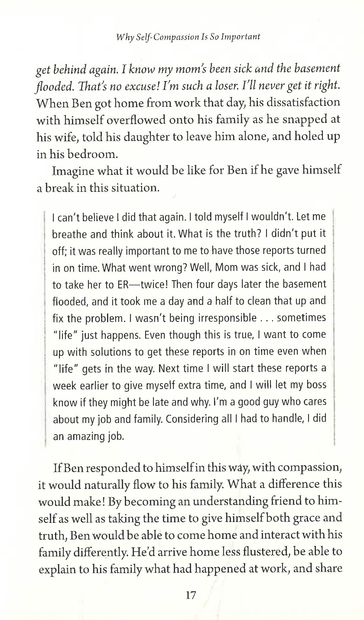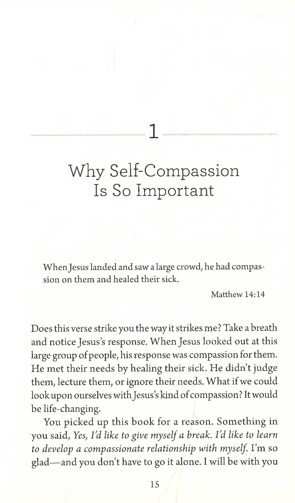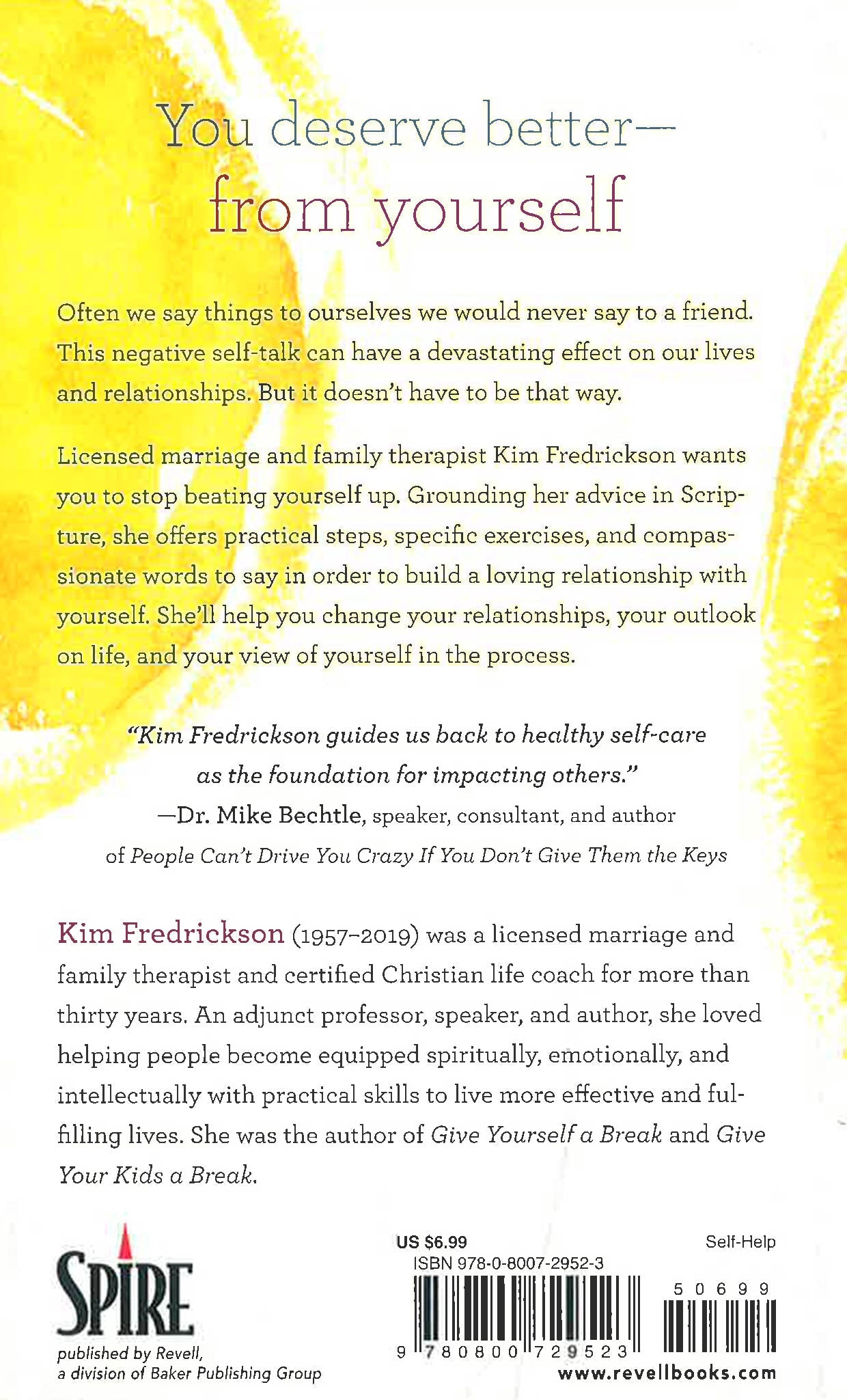Many people are used to showing compassion to others. What many of us have trouble with is showing that same compassion to ourselves. Licensed marriage and family therapist Kim Fredrickson wants readers to stop beating themselves up. Grounding her advice in the Bible, she offers practical steps, specific exercises, and compassionate words to say in order to build a loving relationship with ourselves. Through inspiring stories of transformation, she helps us learn to show ourselves the kind of grace and understanding we offer to others--and to change our relationships, our outlook on life, and our view of ourselves in the process.