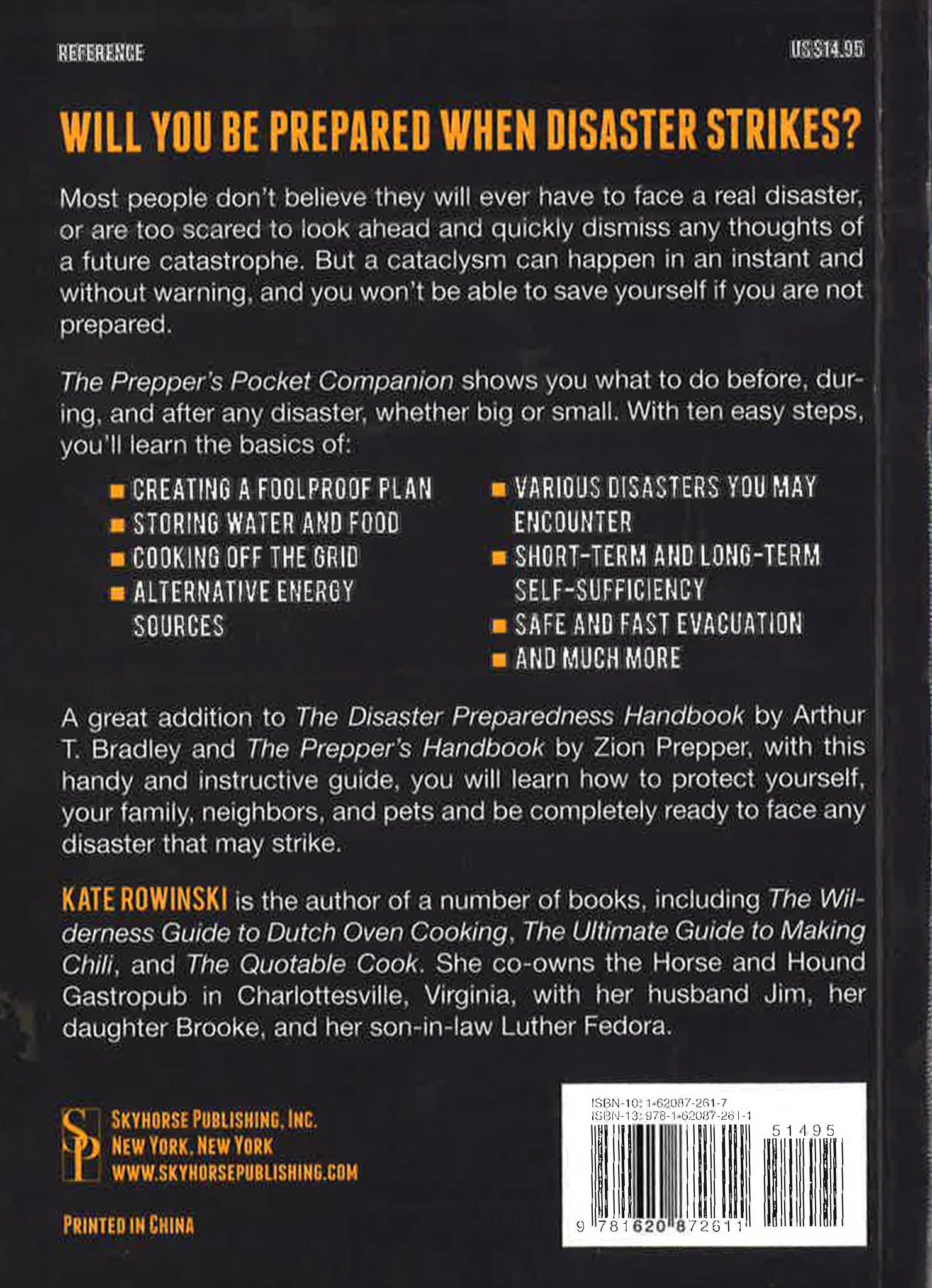 Most people don?t believe they will ever have to face a real disaster, or are too scared to look ahead and quickly dismiss any thoughts of a future catastrophe. But a cataclysm can happen in an instant and without warning, and you won?t be able to save yourself if you are not prepared.The Prepper?s Pocket Companion shows you what to do before, during, and after any disaster, whether big or small. With ten easy steps, you?ll learn the basics of:? Creating a foolproof plan? Storing water and food? Cooking off the grid? Alternative energy sources? Various disasters you may encounter? Short-term and long-term self-sufficiency? Safe and fast evacuation? And much moreWith this handy and instructive guide, you will learn how to protect yourself, your family, neighbors, and pets and be completely ready to face any disaster that may strike.