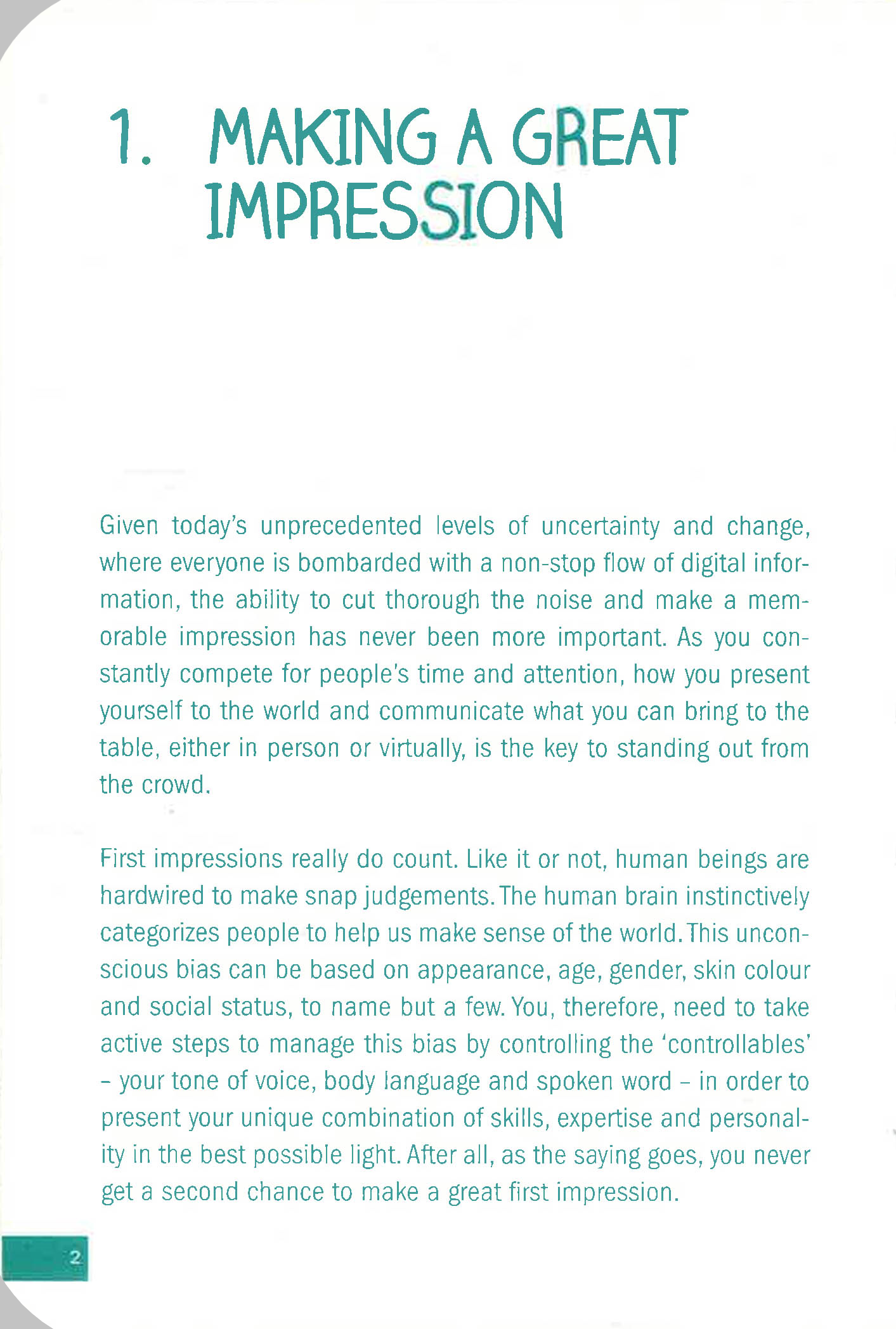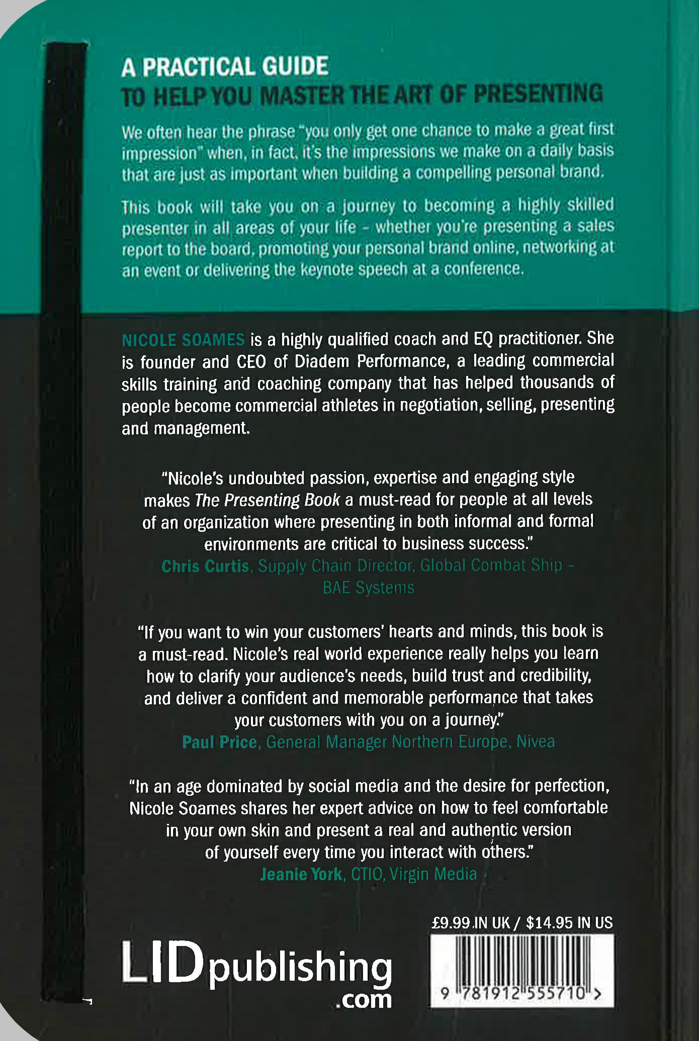 We often hear the phrase “you only get one chance to make a great first impression” when, in fact, it’s the impressions we make on a daily basis that make a compelling personal brand. In today’s increasingly competitive world, the ability to present the best version of yourself in both formal and informal situations is critical to your success. The Presenting Book is an inspiring and engaging handbook packed with Nicole Soames’ expert advice, practical tools and exercises. This book will teach you how to become a highly skilled presenter in all areas of your life – whether you’re presenting a sales report to the board, promoting your personal brand online, networking at an event or being the key- note speaker at a conference. You’ll learn how to develop your emotional intelligence, capture and hold peoples’ attention and deliver your performance with confidence.