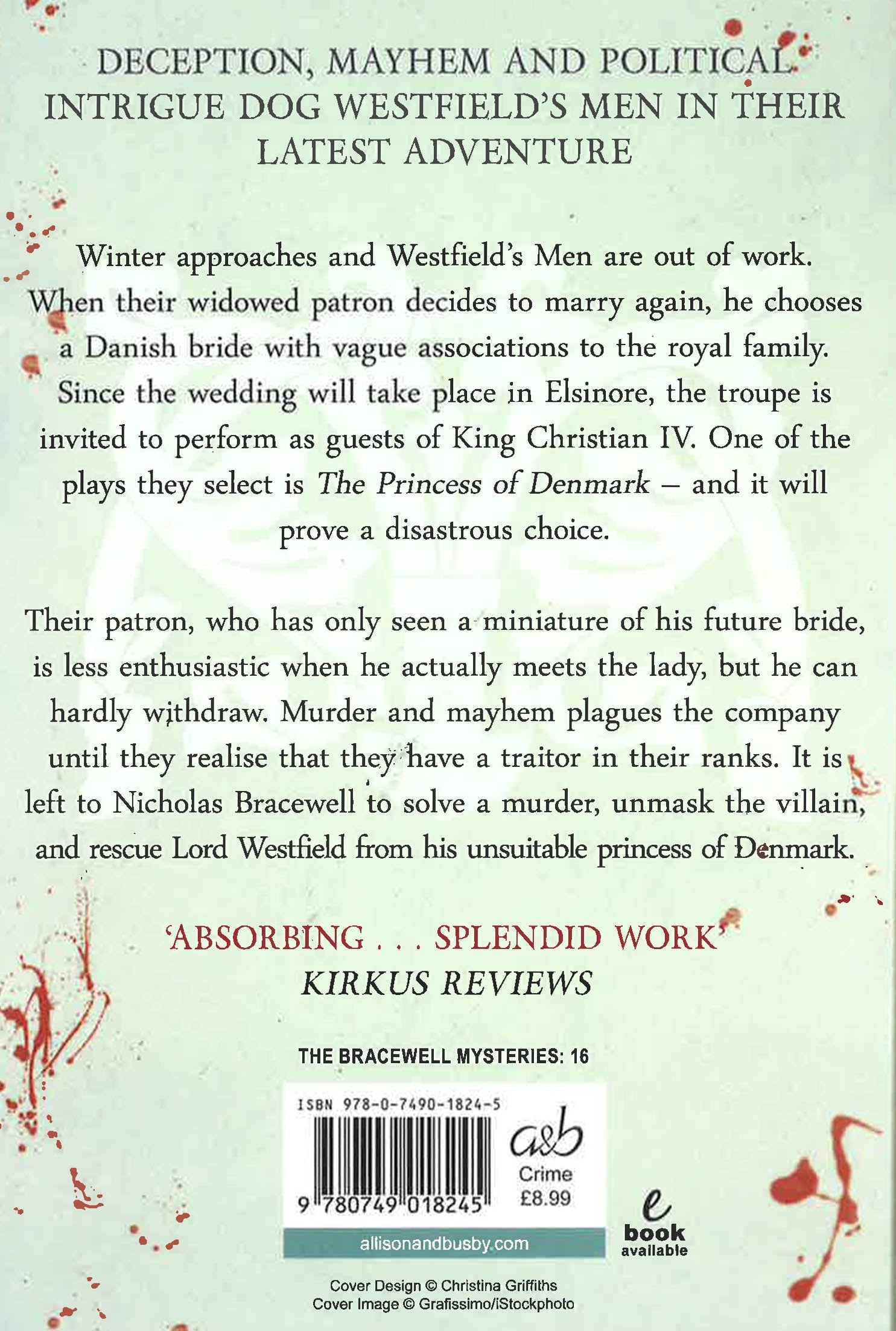 Winter approaches and Westfield's Men are out of work. When their widowed patron decides to marry again, he chooses a Danish bride with vague associations to the royal family. Since the wedding will take place in Elsinore, the troupe is invited to perform as guests of King Christian IV. One of the plays they select is The Princess of Denmark - and it will prove a disastrous choice. Westfield's Men soon find themselves embroiled in political intrigue and religious dissension. Their patron, who has only seen a miniature of his future bride, is less enthusiastic when he actually meets the lady, but he can hardly withdraw. Murder and mayhem dogs the company until they realize that they have a traitor in their ranks. It is left to Nicholas Bracewell to solve a murder, unmask the villain, and rescue Lord Westfield from his unsuitable princess of Denmark.