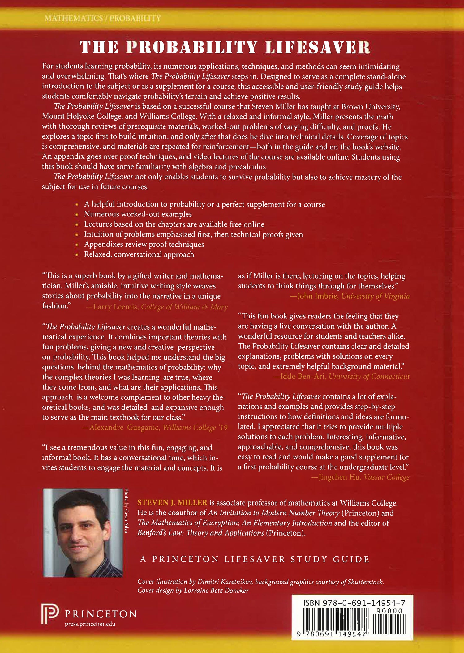 The essential lifesaver for students who want to master probability For students learning probability, its numerous applications, techniques, and methods can seem intimidating and overwhelming. That's where The Probability Lifesaver steps in. Designed to serve as a complete stand-alone introduction to the subject or as a supplement for a course, this accessible and user-friendly study guide helps students comfortably navigate probability's terrain and achieve positive results. The Probability Lifesaver is based on a successful course that Steven Miller has taught at Brown University, Mount Holyoke College, and Williams College. With a relaxed and informal style, Miller presents the math with thorough reviews of prerequisite materials, worked-out problems of varying difficulty, and proofs. He explores a topic first to build intuition, and only after that does he dive into technical details. Coverage of topics is comprehensive, and materials are repeated for reinforcement--both in the guide and on the book's website. An appendix goes over proof techniques, and video lectures of the course are available online. Students using this book should have some familiarity with algebra and precalculus. The Probability Lifesaver not only enables students to survive probability but also to achieve mastery of the subject for use in future courses. * A helpful introduction to probability or a perfect supplement for a course* Numerous worked-out examples* Lectures based on the chapters are available free online* Intuition of problems emphasized first, then technical proofs given* Appendixes review proof techniques* Relaxed, conversational approach