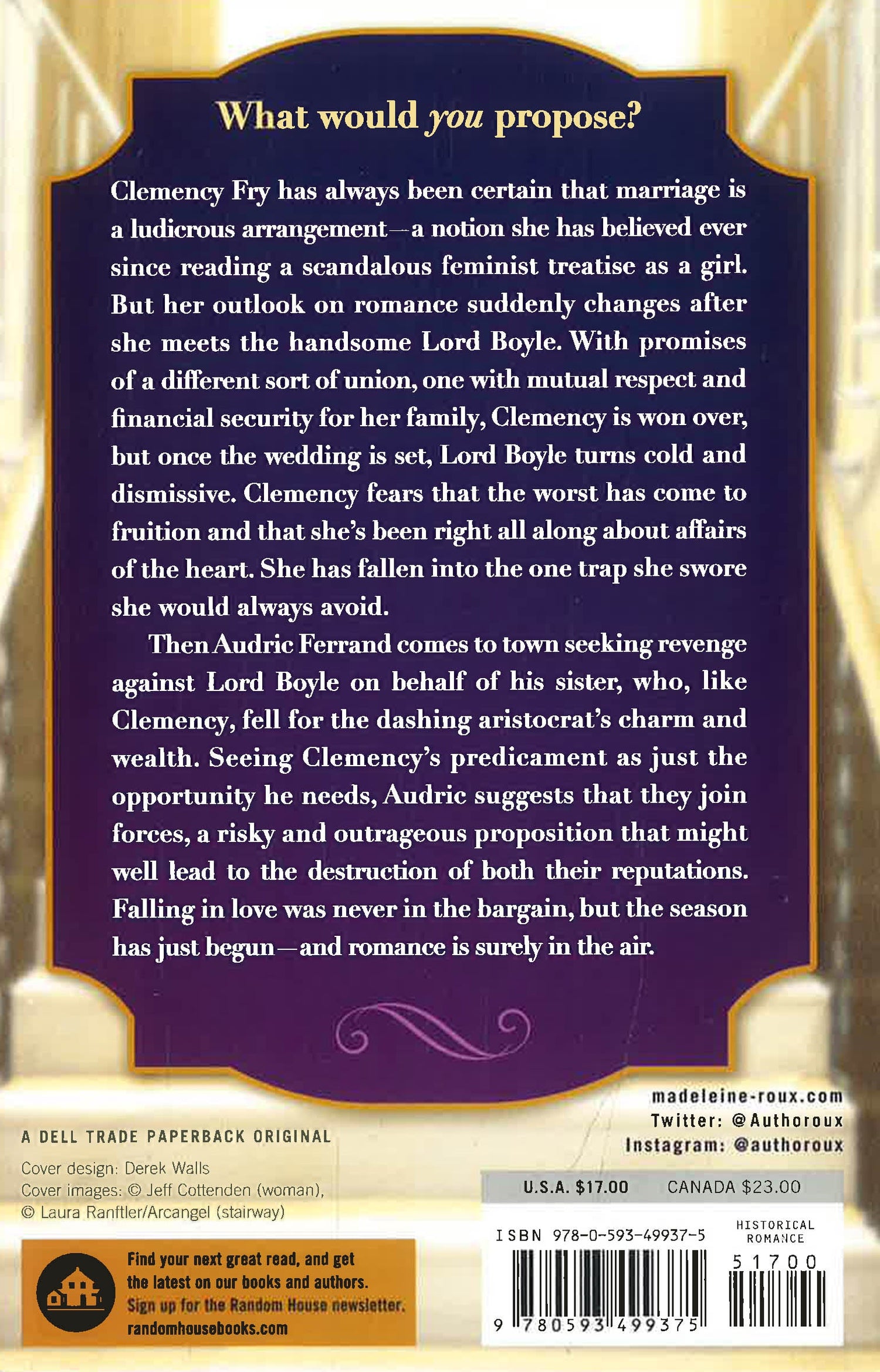 Then Audric Ferrand comes to town seeking revenge against Lord Boyle on behalf of his sister, who also fell for his charm and wealth. Audric sees Clemency’s predicament as the opportunity he needs. He suggests they join forces, a proposition that is risky and outrageous, and could possibly lead to the destruction of both their reputations. Falling in love was never in the bargain, but the season has just begun—and romance is surely in the air.